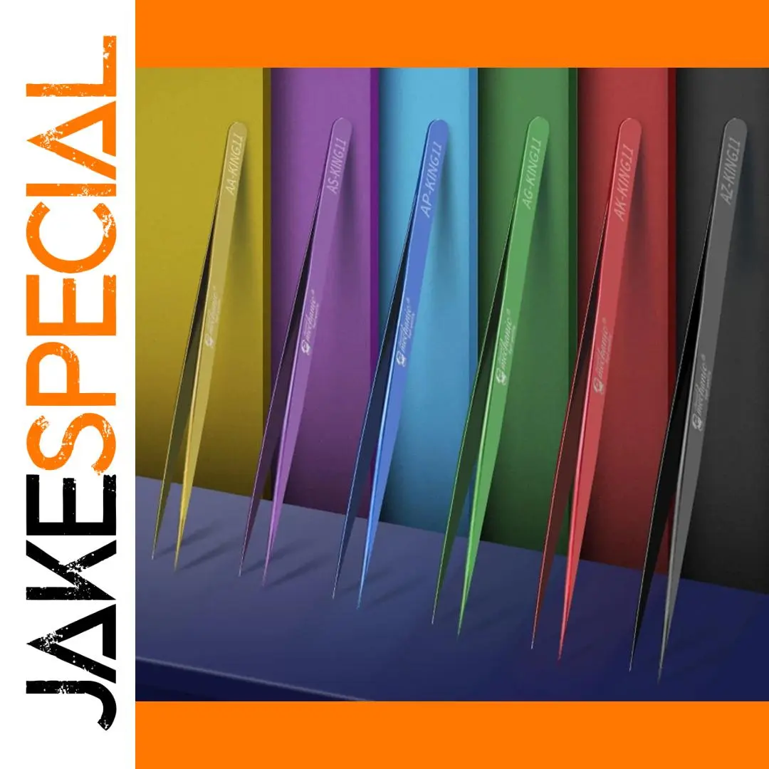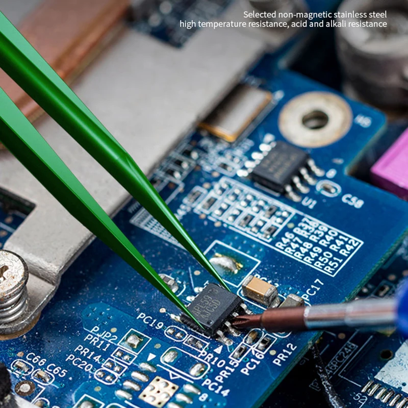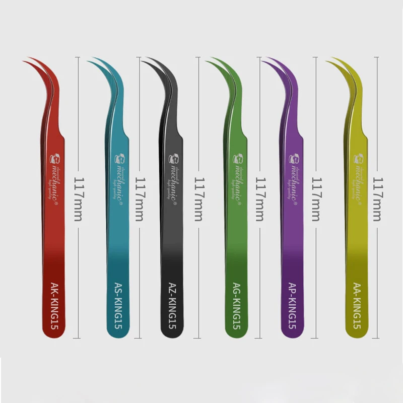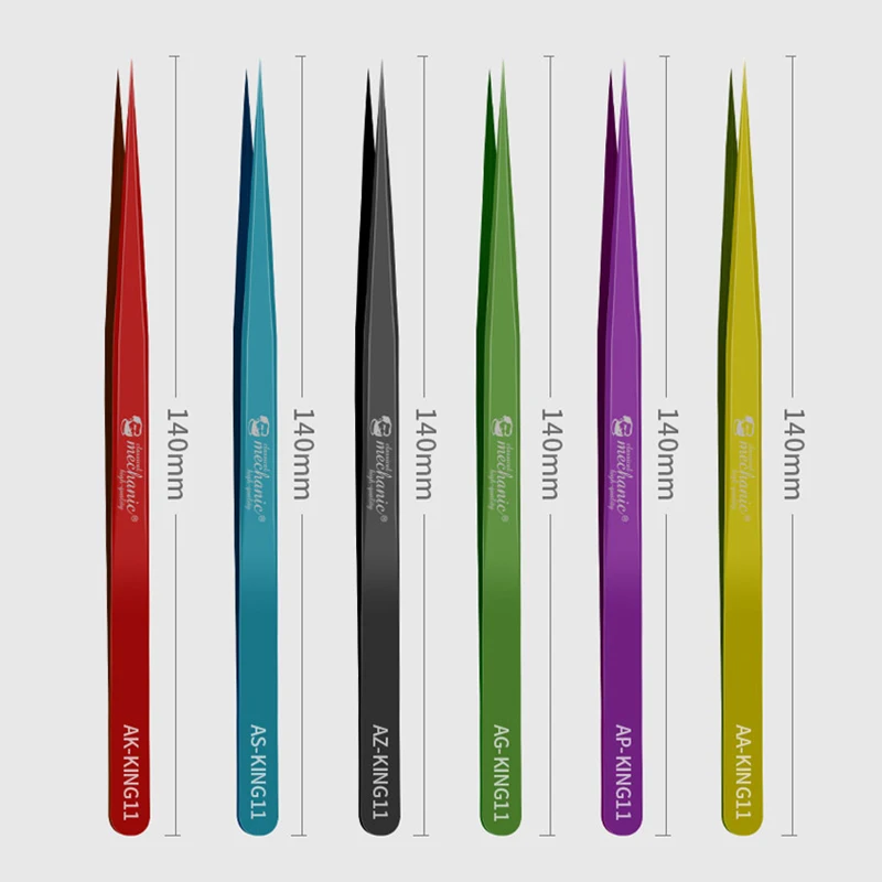 Experience unmatched precision with this sleek set of six MECHANIC precision tweezers, each crafted from high-quality stainless steel. Featuring vibrant colors—blue, red, black, gold, green, and purple—these tweezers combine durability with aesthetic appeal. Their finely pointed, sharp or bent tips provide exceptional control for delicate tasks such as electronic PCB repair, motherboard maintenance, IC handling, or watch and glasses repair. Designed to resist heat, acids, and alkalis, they offer reliable performance even in challenging environments. The scratch-resistant, smooth surface coating ensures comfortable handling and long-lasting sharpness, making this set a must-have professional tool for technicians and enthusiasts alike. Elevate your craftsmanship with these stylish, high-toughness tweezers.