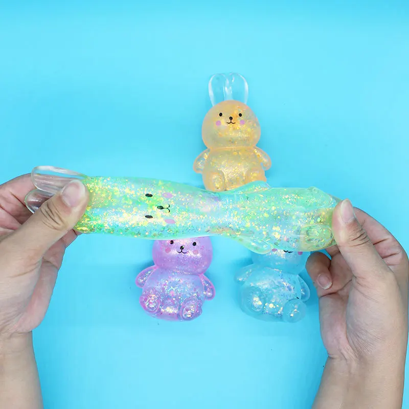 Experience soothing stress relief with this adorable rabbit-shaped toy made from soft, flexible TPR material. Featuring vibrant, translucent colors—pink, blue, orange, and light green—it is embedded with multicolored sequins that shimmer and reflect light for visual stimulation. Measuring approximately 1 piece, this elastic squeeze toy offers a slow rebound effect, making it perfect for decompression during stressful moments. Designed for ages 14 and older, it is certified under CCC and free from high concern chemicals. Its playful animal and nature theme, combined with its glittery, charming appearance, makes it an engaging tactile object ideal for relaxation and fun.