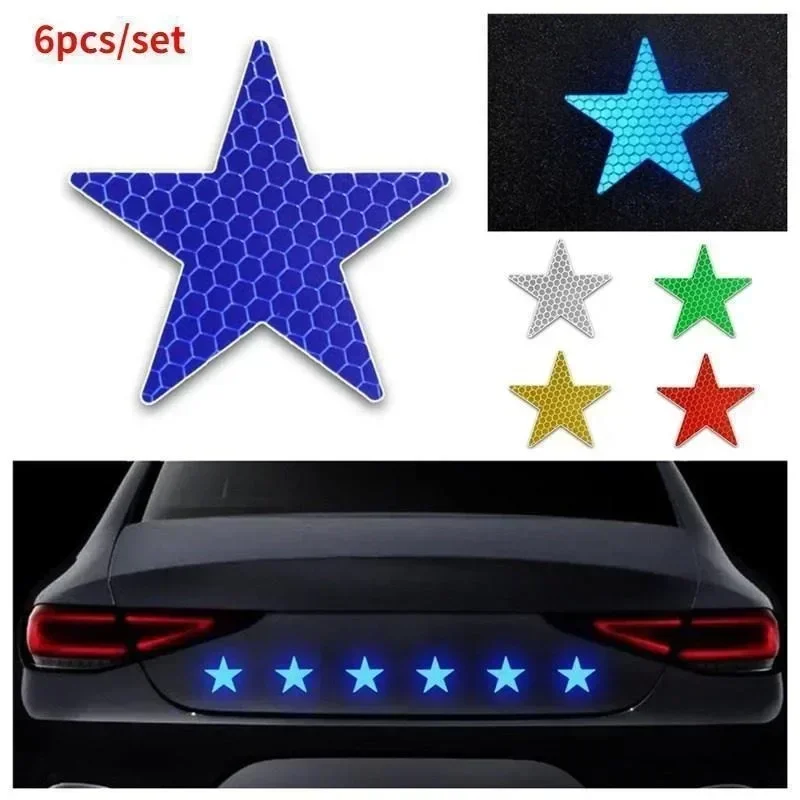 Enhance your vehicle's visibility and add a personalized touch with this set of six vibrant, star-shaped reflective stickers. Designed for practical safety and eye-catching decoration, these stickers are ideal for improving low-light visibility on cars, motorcycles, trucks, or outdoor gear. Made from durable, water-resistant PVC, they feature a glossy, honeycomb-textured reflective surface that amplifies light to make your vehicle stand out during nighttime. Their colorful finish in white, yellow, red, blue, green, silver, and gold ensures a lively appearance. Easy to apply on flat surfaces, these stickers combine safety and style effortlessly, making your vehicle or outdoor possessions more noticeable and personalized. Experience enhanced visibility and a charming aesthetic at once.
