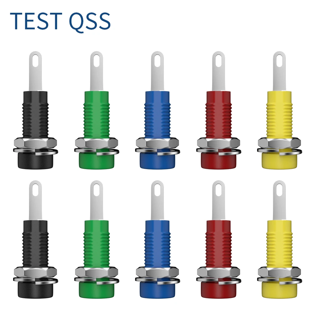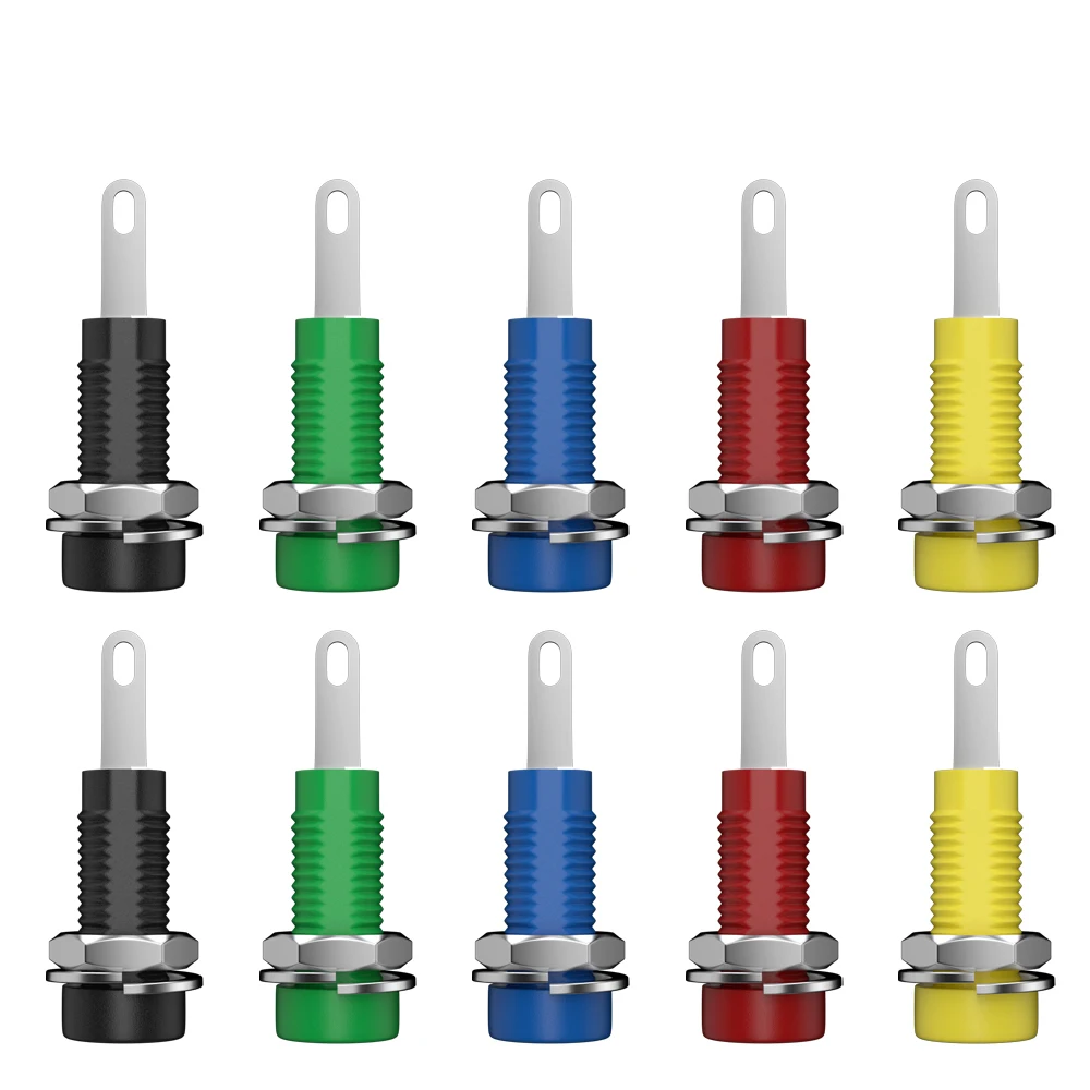 Imagine enhancing your electrical projects with this vibrant, reliable set of banana sockets. Designed for effortless installation, each socket features a 2mm diameter with spring tabs that ensure a secure, stable connection. The set includes ten sockets, available in multiple color options such as red, green, black, blue, and yellow, to help you clearly differentiate circuits. The ribbed, cylindrical plastic bodies provide both durability and a tactile grip, while the metal hardware, including a hexagonal nut and circular flange, offers a sleek industrial look and secure mounting. Perfect for hobbyists and professionals alike, these sockets bring color-coded convenience and dependable performance to your electrical work.