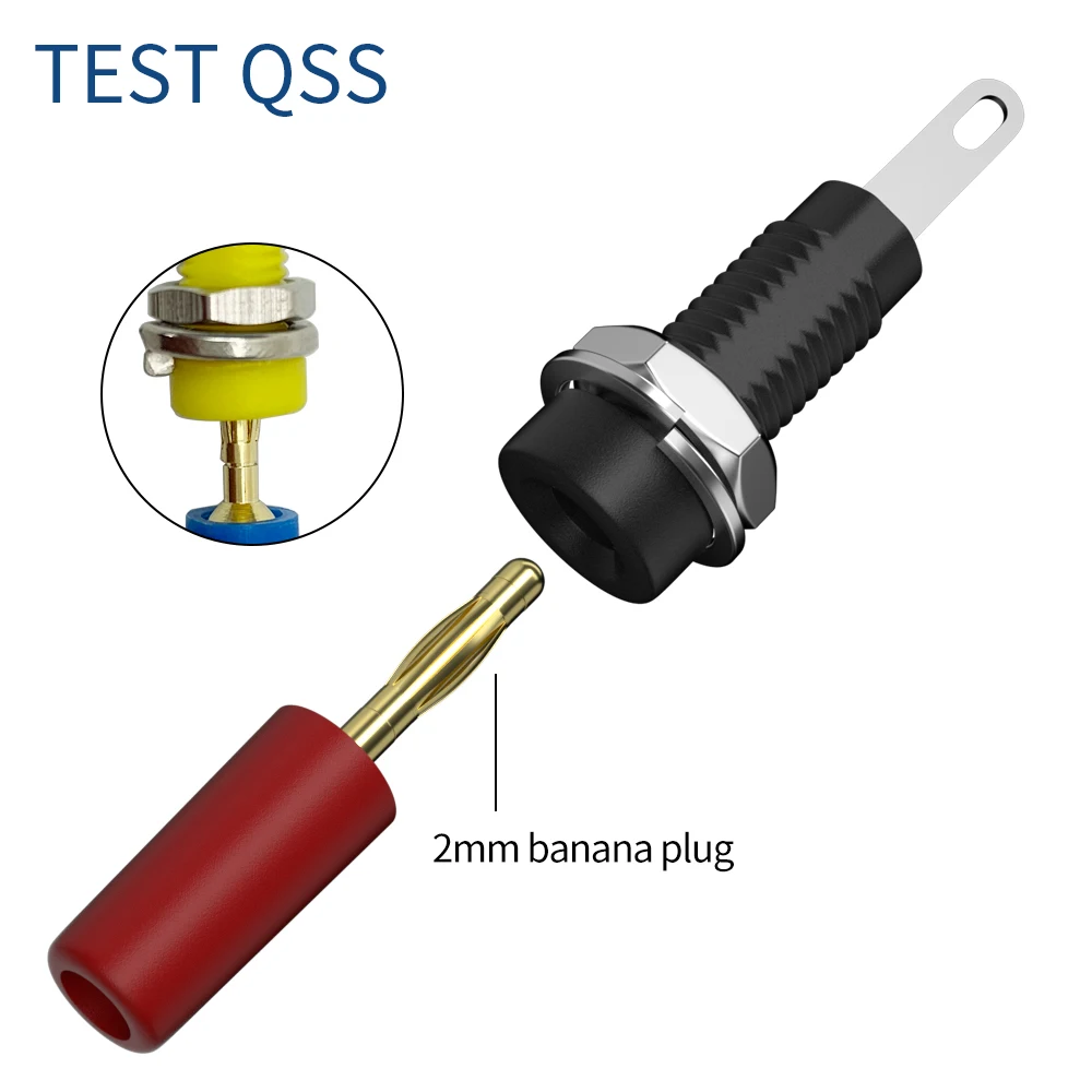 - Technical specifications include a 2mm contact diameter, with parts sourced from a reputable manufacturer, ensuring long-lasting performance and compatibility with various banana plugs or test leads.