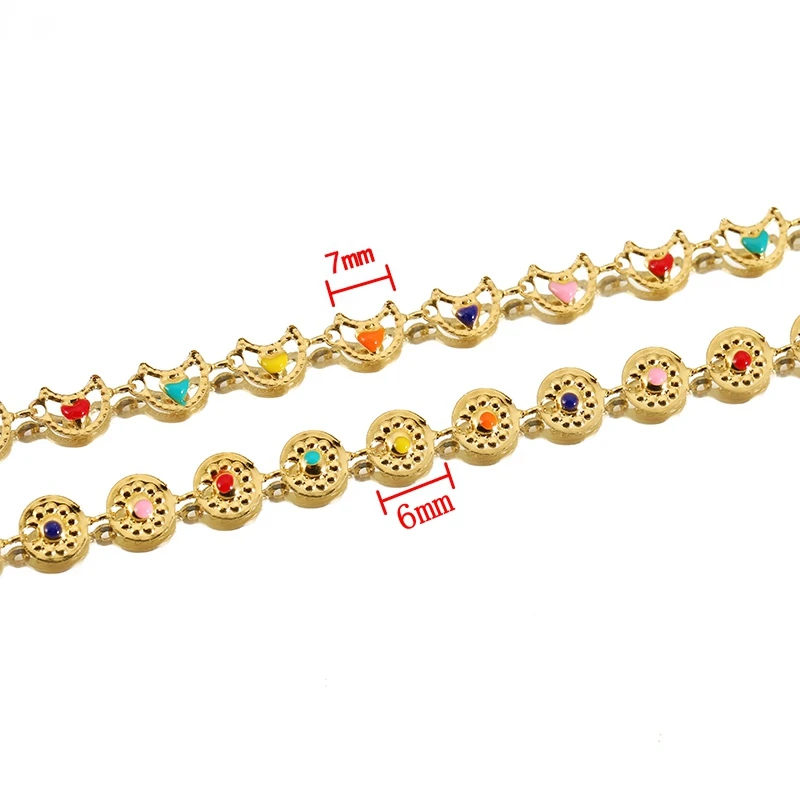 Transform your jewelry creations with this stunning 1-meter stainless steel chain featuring a colorful enamel coating. Designed with a round sector shape, each link measures 6mm in diameter, providing a bold yet delicate aesthetic. Perfect for adding a lively touch to bracelets, necklaces, anklets, and earrings, this chain is ideal for craft enthusiasts looking to express their creativity. Its gold-toned base offers durability and a luxurious finish, ensuring long-lasting wear. Available in two eye-catching color variants, Gold-A and Gold-B, the chain combines vibrant shades of pink, blue, yellow, orange, and purple with a high-gloss enamel coating. The fine craftsmanship and versatile style make this chain an essential component for Bohemia-inspired or eclectic jewelry designs.
