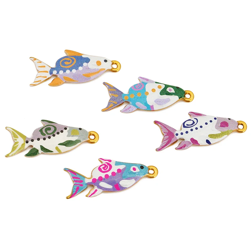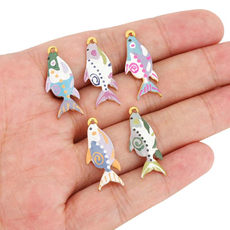 Imagine adding a splash of vibrant creativity to your jewelry projects with this set of three colorful shark-shaped charms. Crafted from durable stainless steel, each charm is coated with bright enamel and features playful, ink-painted shark designs. The lively patterns include spots, swirling motifs, and decorative accents, giving your necklaces, bracelets, or earrings a whimsical and artistic touch. With their polished finish and vivid colors—including lavender, orange, purple, green, pink, blue, white, and gray—these charms are perfect for expressing fun and individuality. Easy to incorporate into your custom pieces, these charms are ideal for DIY jewelry enthusiasts looking to craft unique accessories that stand out.
