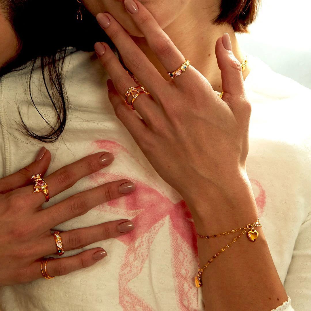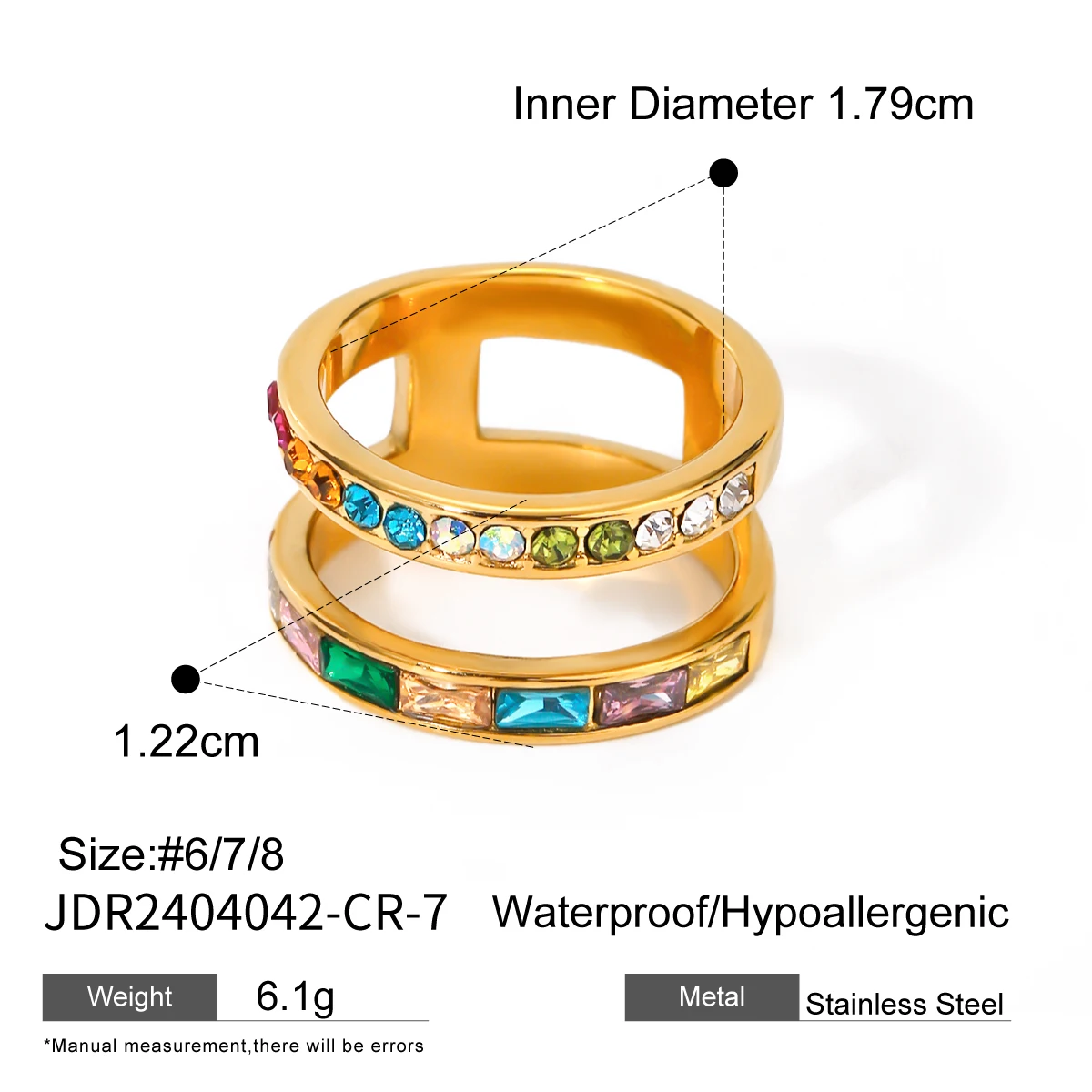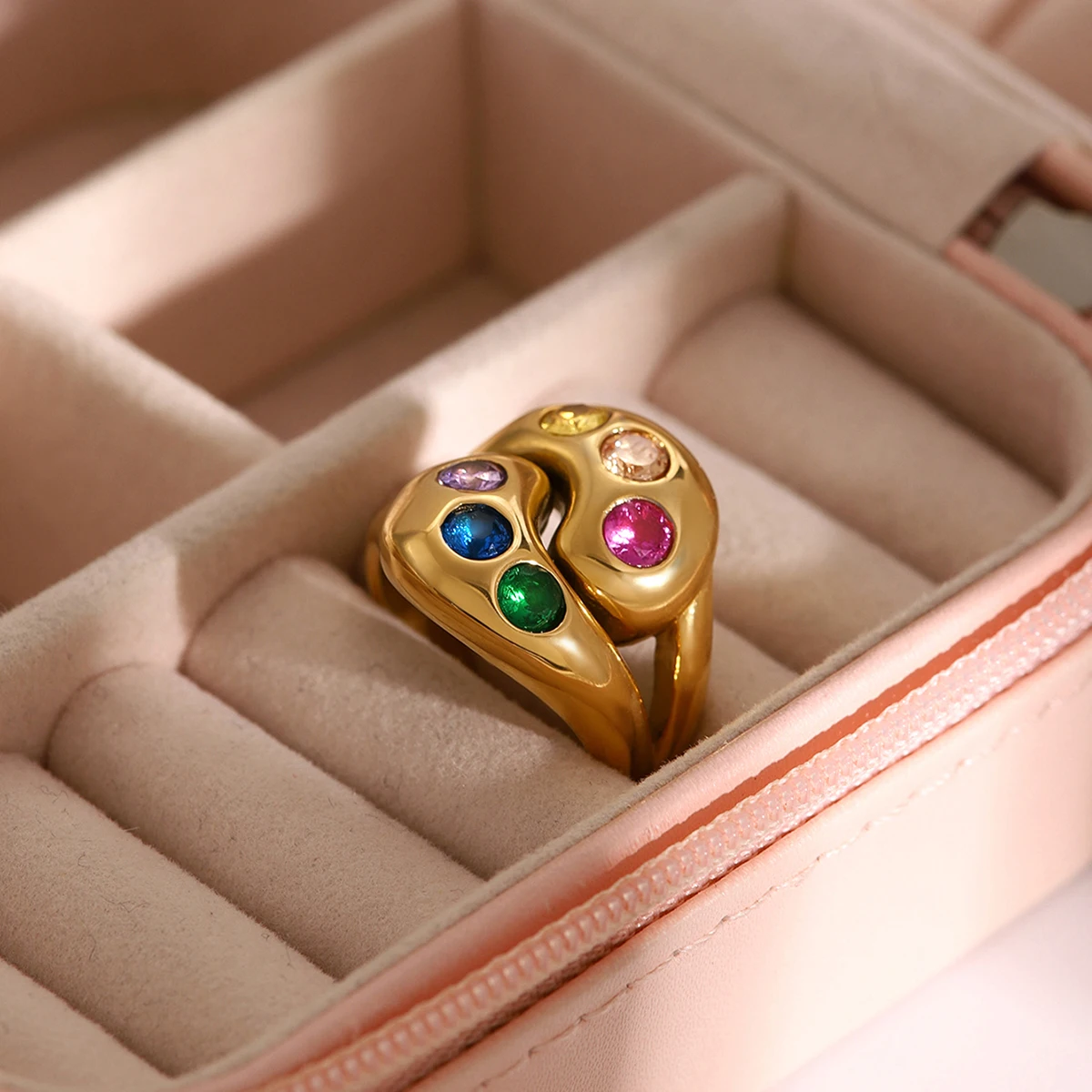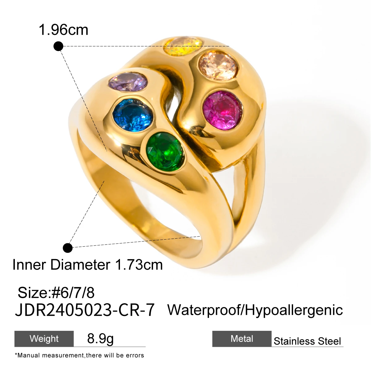 Elevate your jewelry collection with this stainless steel zircon ring set, featuring five luxurious gold-finished rings available in sizes 6, 7, and 8. Each piece showcases vibrant multicolored zircon stones in pink, green, blue, yellow, purple, and black, securely set in round prong settings. The collection offers a variety of styles, from whimsical irregular arrangements and minimalist designs to intricate floral patterns and broad polished bands, ensuring versatile elegance. Waterproof, corrosion-resistant, and tarnish-free, these rings deliver lasting shine, durability, and comfort, making them perfect for daily wear or special occasions, adding a colorful and sophisticated touch to your look.