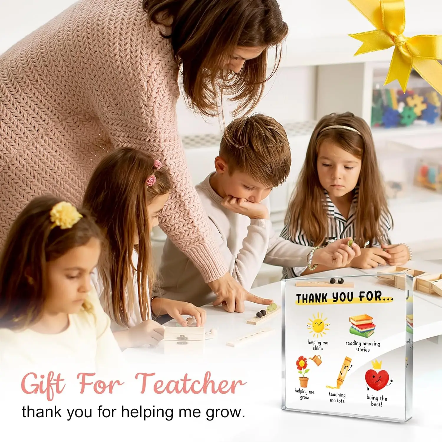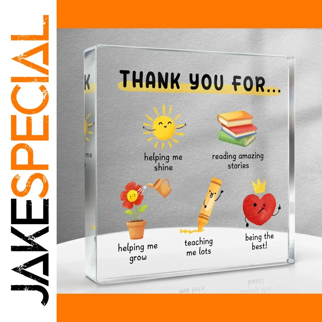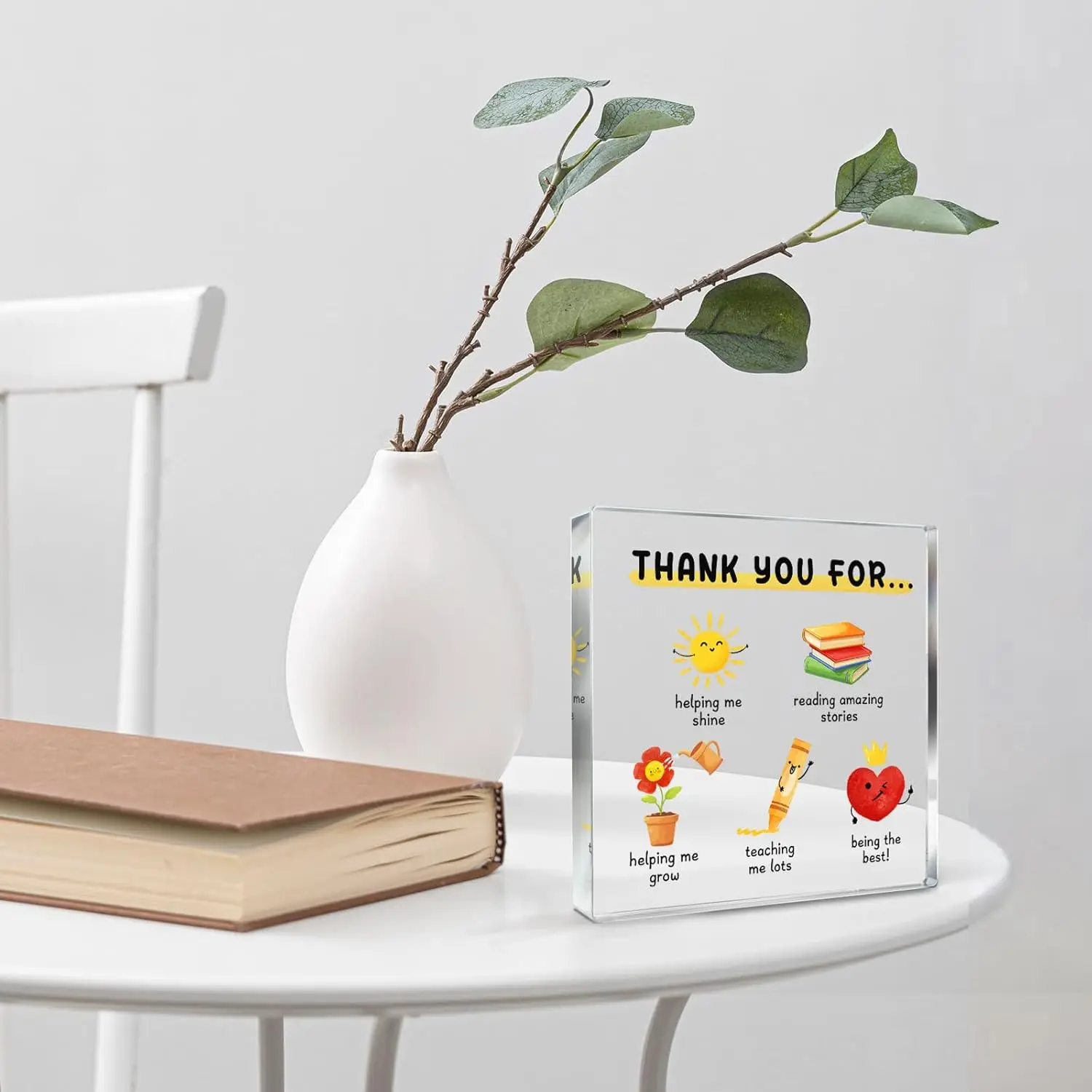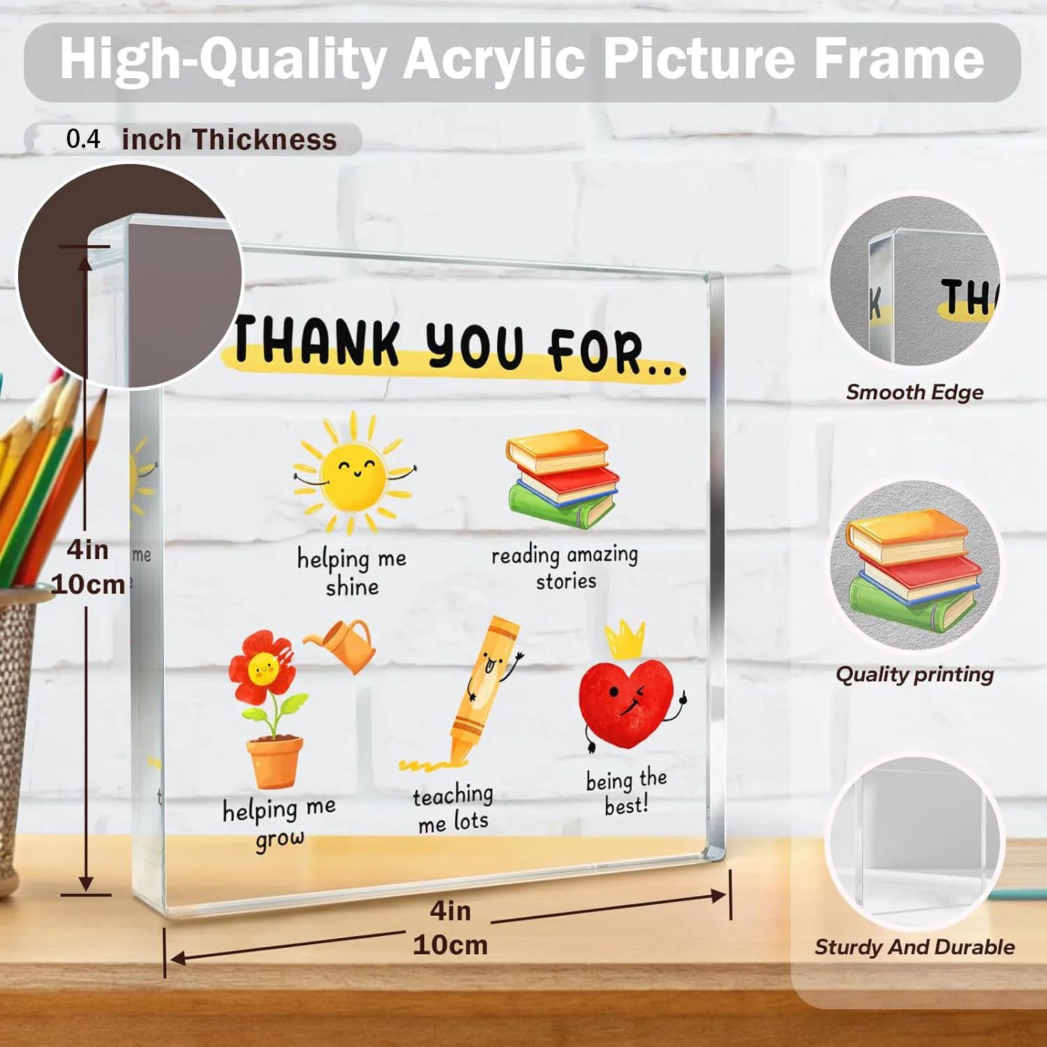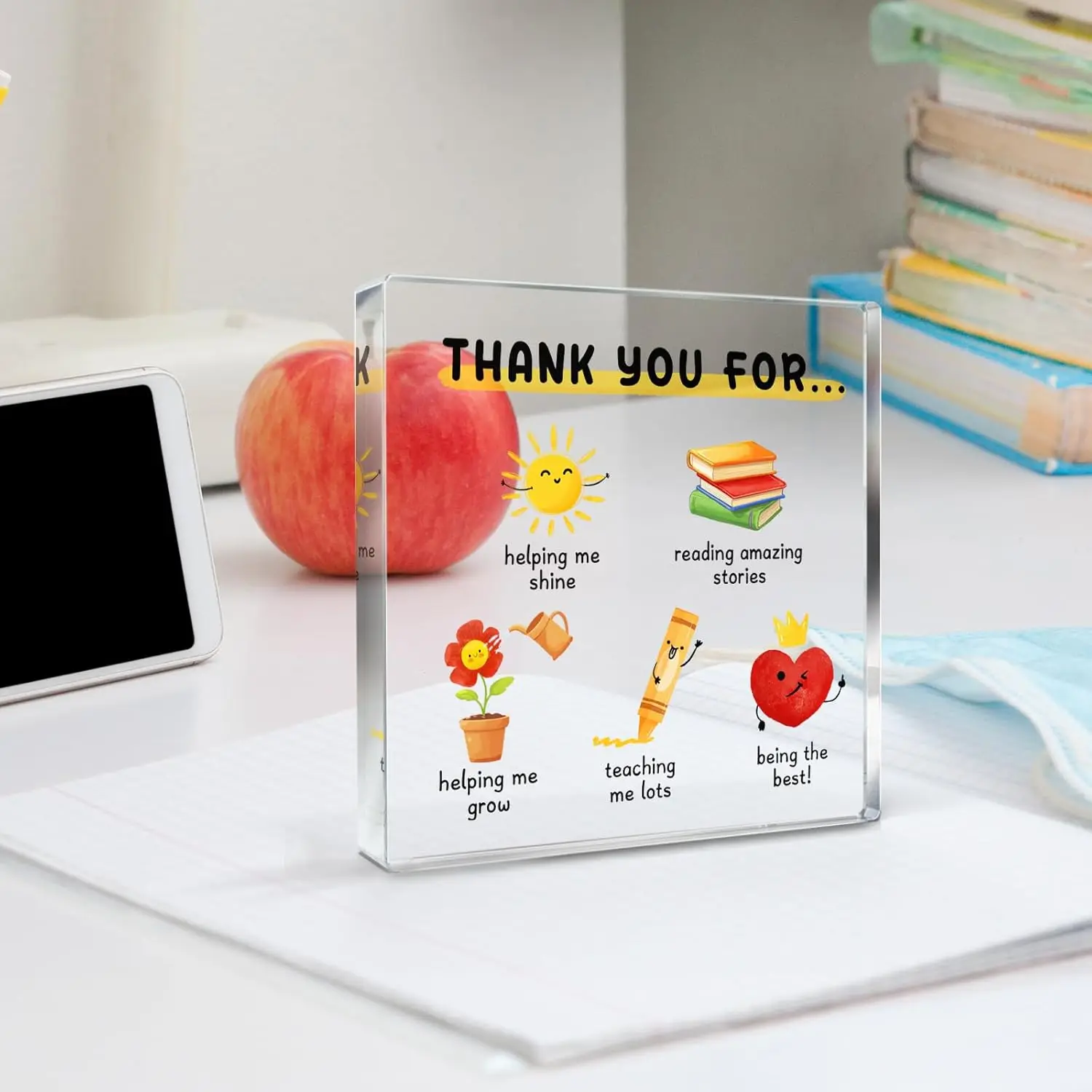 Imagine celebrating a special educator or coworker with this beautifully designed acrylic plaque. Its clear, rectangular surface features lively, colorful illustrations that evoke joy and gratitude. Bright yellows, reds, greens, and oranges animate the cheerful design, including a smiling sun, playful books, a watering can, a happy crayon, and a charming heart crown. The slightly beveled edges add a sophisticated touch, complementing the vivid graphics and smooth finish. Perfect for decorating desks, offices, or display shelves, this gift conveys appreciation in a fun, uplifting way. Its sleek, transparent appearance ensures the vibrant imagery stands out beautifully, making it a heartfelt token for any occasion marking gratitude and recognition.