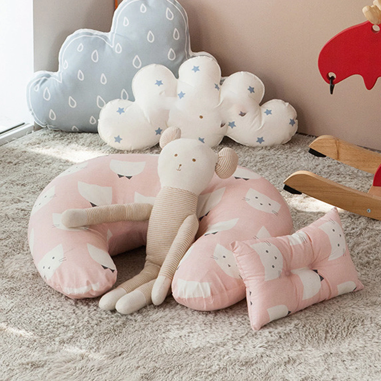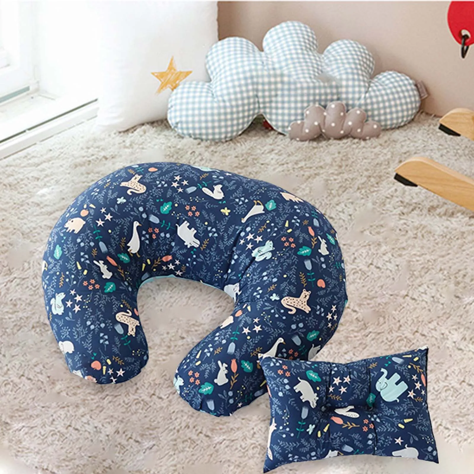 Experience the comfort and charm of this this vibrant U-shaped nursing and support cushion, designed to bring cozy support to both mother and baby. Crafted with breathable pure cotton fabric covered by a removable, machine-washable cover, it ensures easy maintenance and long-lasting freshness. Filled with soft PP silk cotton, the ergonomic shape offers gentle yet firm support for breastfeeding, pregnancy, or relaxing. Its versatile design can be used as a sleeping pillow, leg relief cushion, or waist support, making it an essential addition to any nursery or living space. The playful patterns and lively colors create a warm, inviting atmosphere that enhances bonding moments. With perfect dimensions of 60×40 cm, this pillow is tailored to provide optimal comfort for your little one and you.