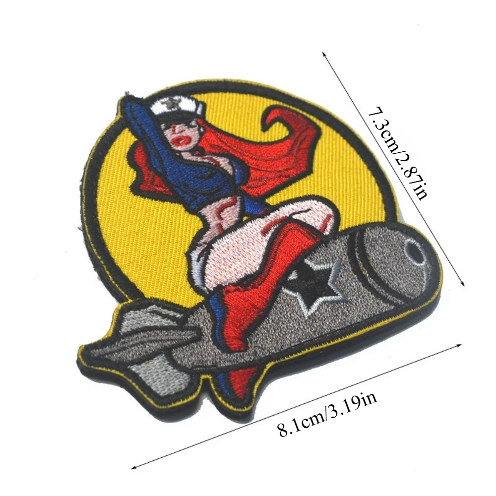 Imagine adding a touch of daring style to your gear with this vibrant embroidered patch. Featuring a comic-inspired female soldier striking a confident pose, this patch captures attention instantly. The design showcases a lively color palette of red, blue, yellow, white, black, and gray, with clear black outlines that make each element pop. The smiling pin-up girl, dressed in a revealing military-inspired outfit, holds a missile with a star symbol beneath her, set against a bright yellow circle background. Perfect for those who love bold, eye-catching designs, this patch brings a playful yet powerful vibe to your clothing or gear. An easy way to personalize your style effortlessly.