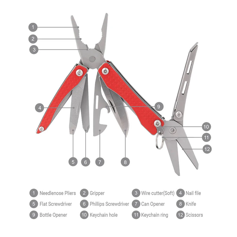 - Features 12 functions including needlenose pliers, flat and Phillips screwdrivers, scissors, knife, bottle and can openers, wire cutter, nail file, and a keychain attachment.