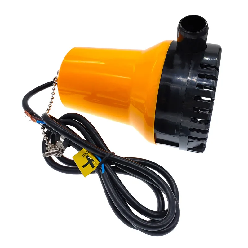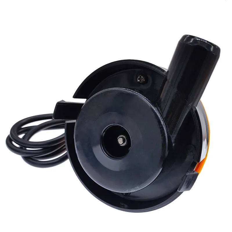 This compact 12V submersible water pump features a sleek, cylindrical design with a bright orange glossy finish and black components, including an angled outlet pipe and flexible cable. Designed for low-pressure water circulation, it operates on 12V DC with a 5A-10A power supply, making it ideal for bilge water removal, fish tanks, water circulation, and agricultural watering. The pump includes a positive brown wire and a negative blue wire for easy connection, with metallic clamp and stainless steel chain accessories to enhance functionality and durability. Its durable, visually striking design ensures reliable performance in underwater applications, providing efficient water management wherever needed.