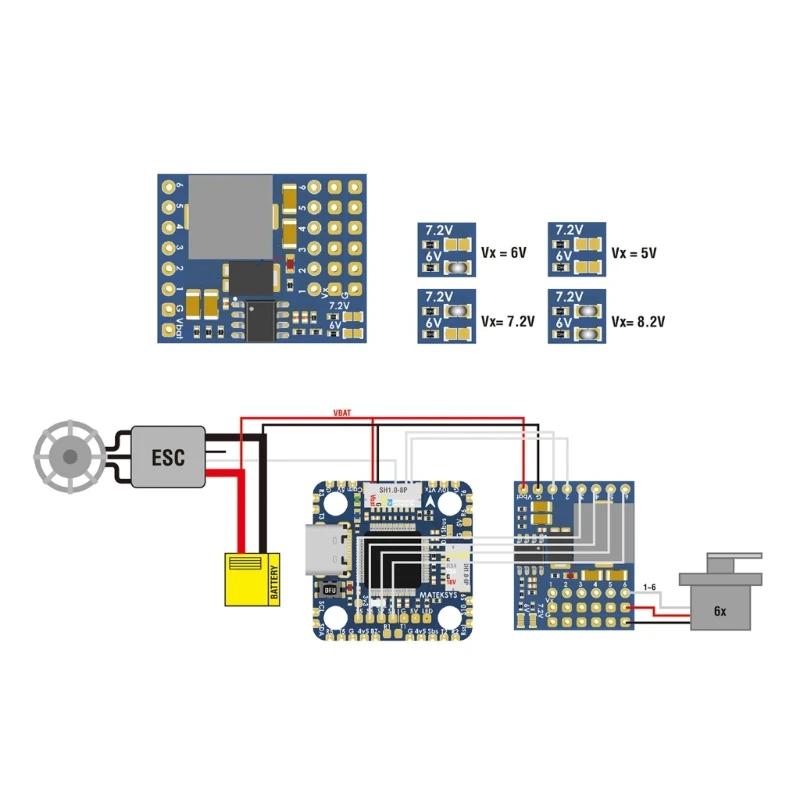 - Supports an input voltage range of 5.5V to 36V with a conversion output of 5V to 8.2V, suitable for a wide variety of drone servo applications.