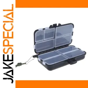 Experience the convenience of organizing your fishing accessories with this stylish black tackle box. Crafted from sturdy engineering plastic, it weighs only 65 grams, making it lightweight and easy to carry. Its compact size of 11.4 cm x 7.3 cm x 3.4 cm fits comfortably in your hand or tackle bag, perfect for outdoor adventures. The box features nine individual compartments, each with a clear viewing lid for quick access and identification of stored items like hooks, lures, and Shimano spinner baits. The durable black exterior, combined with a secure latch and a grayish-green woven lanyard, offers both practicality and a modern aesthetic. Ideal for anglers seeking organization and portability in one reliable fishing accessory.