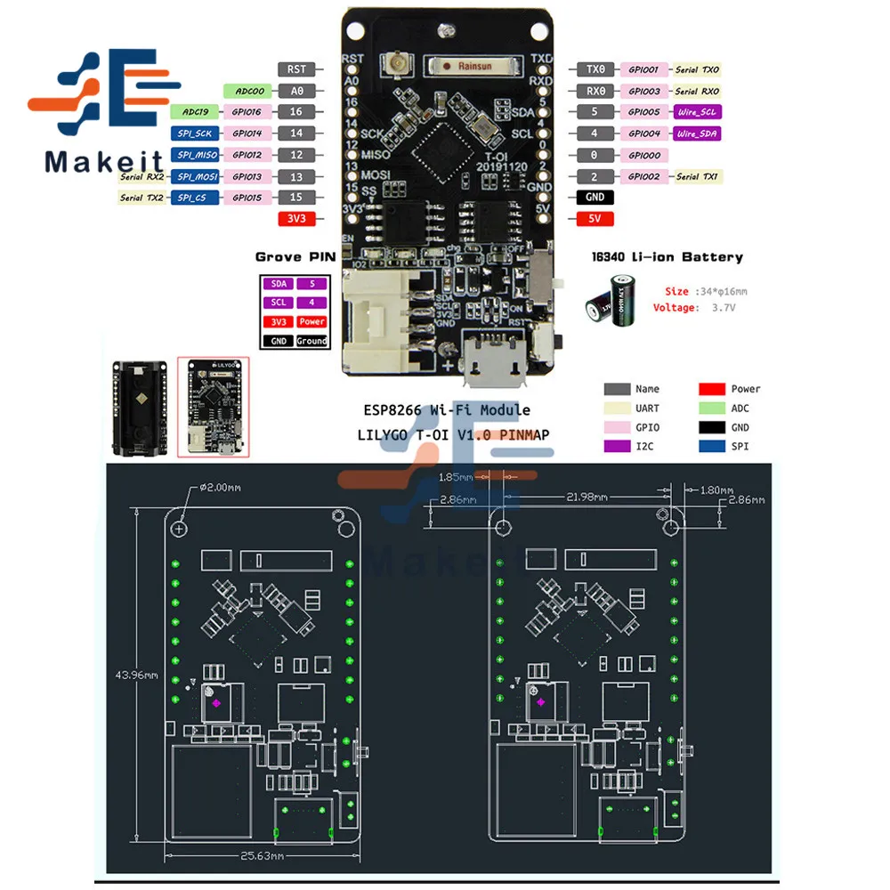 - Reservoir of all I/O ports on both sides, compatible with MINI D1 and standard breadboards for flexible prototyping and expansion.