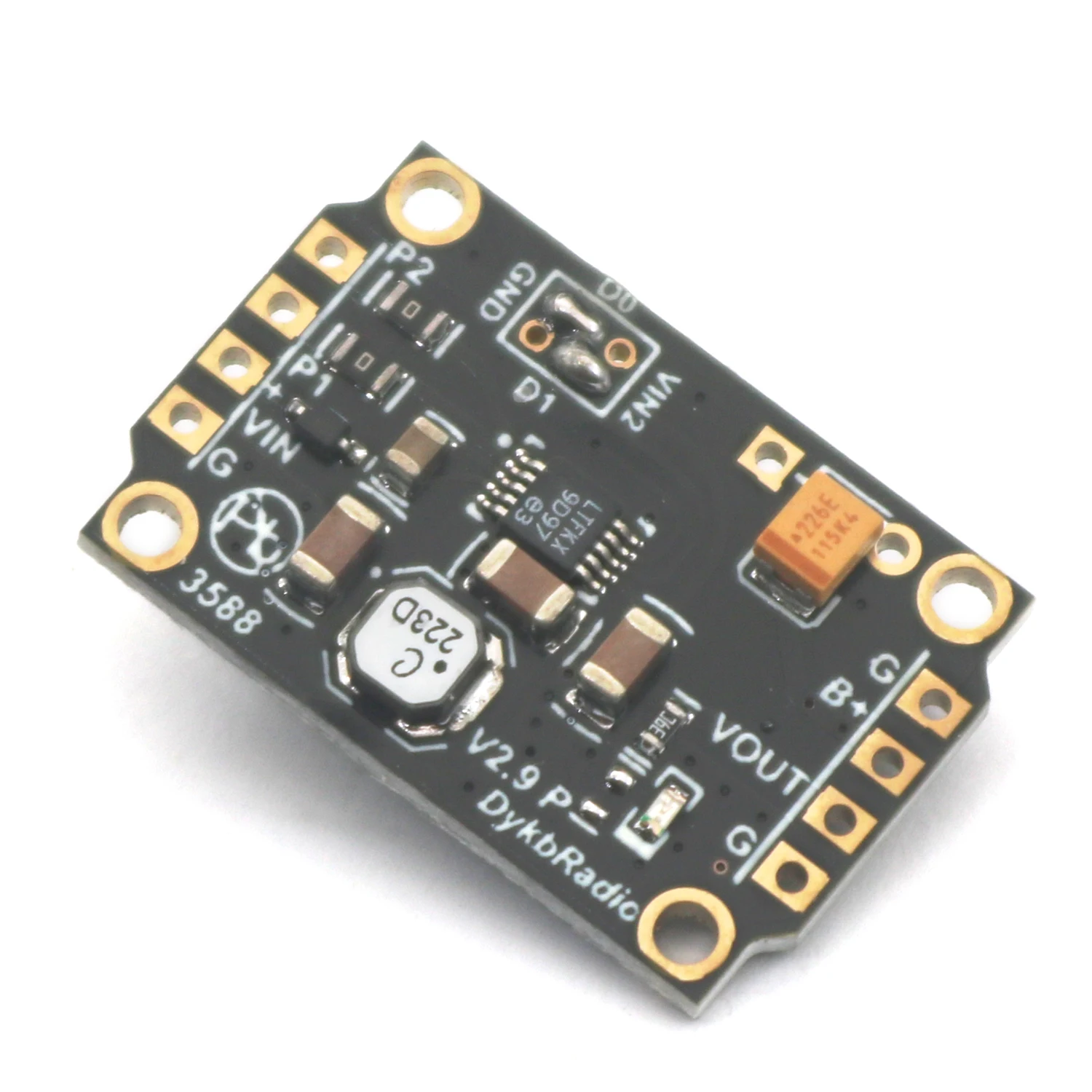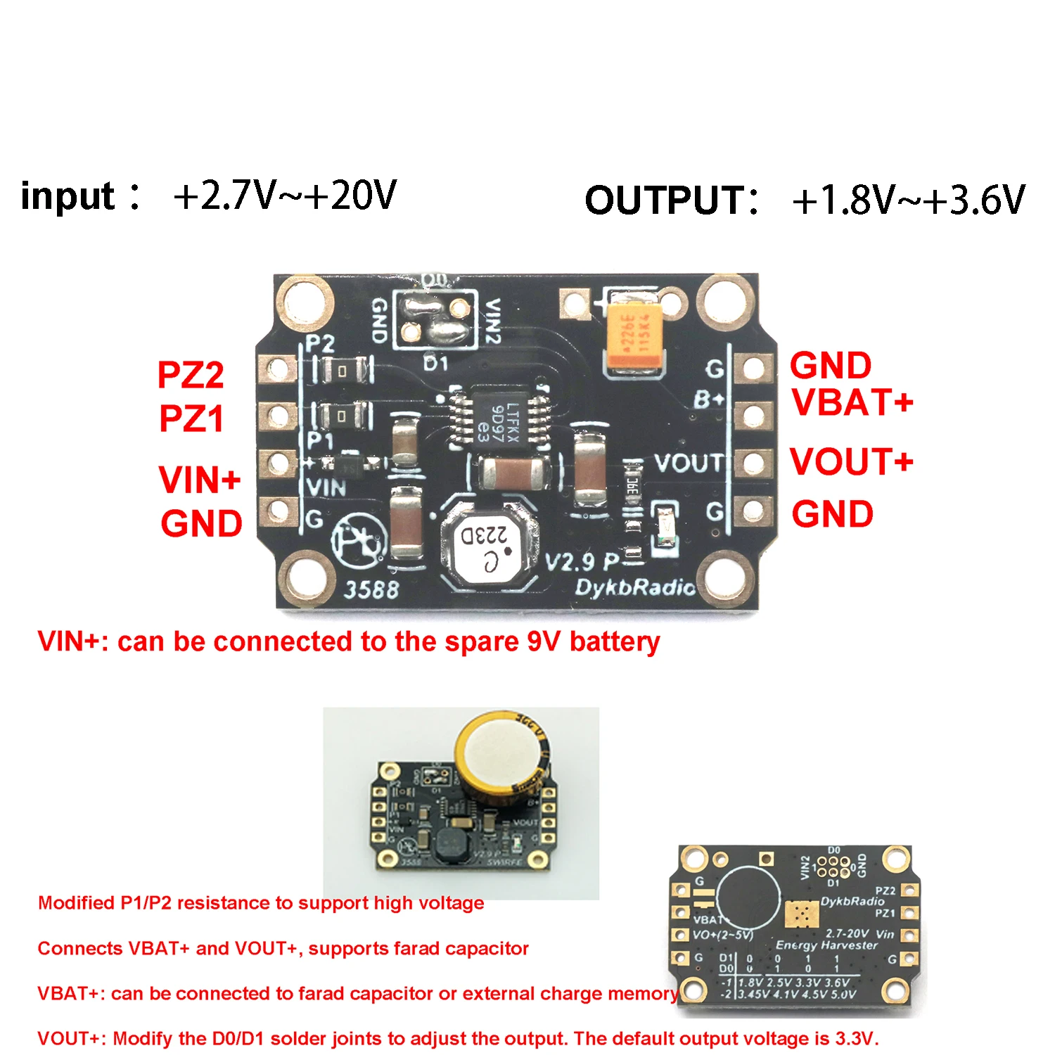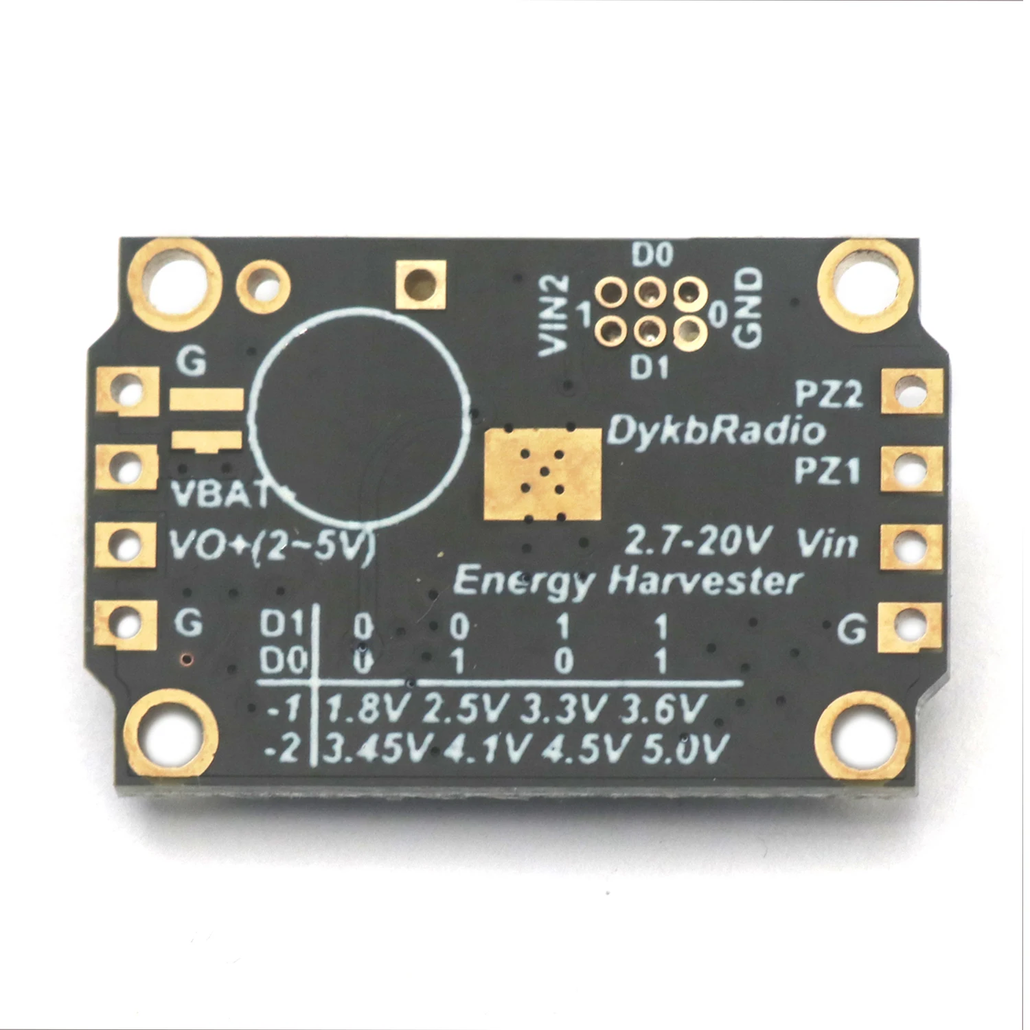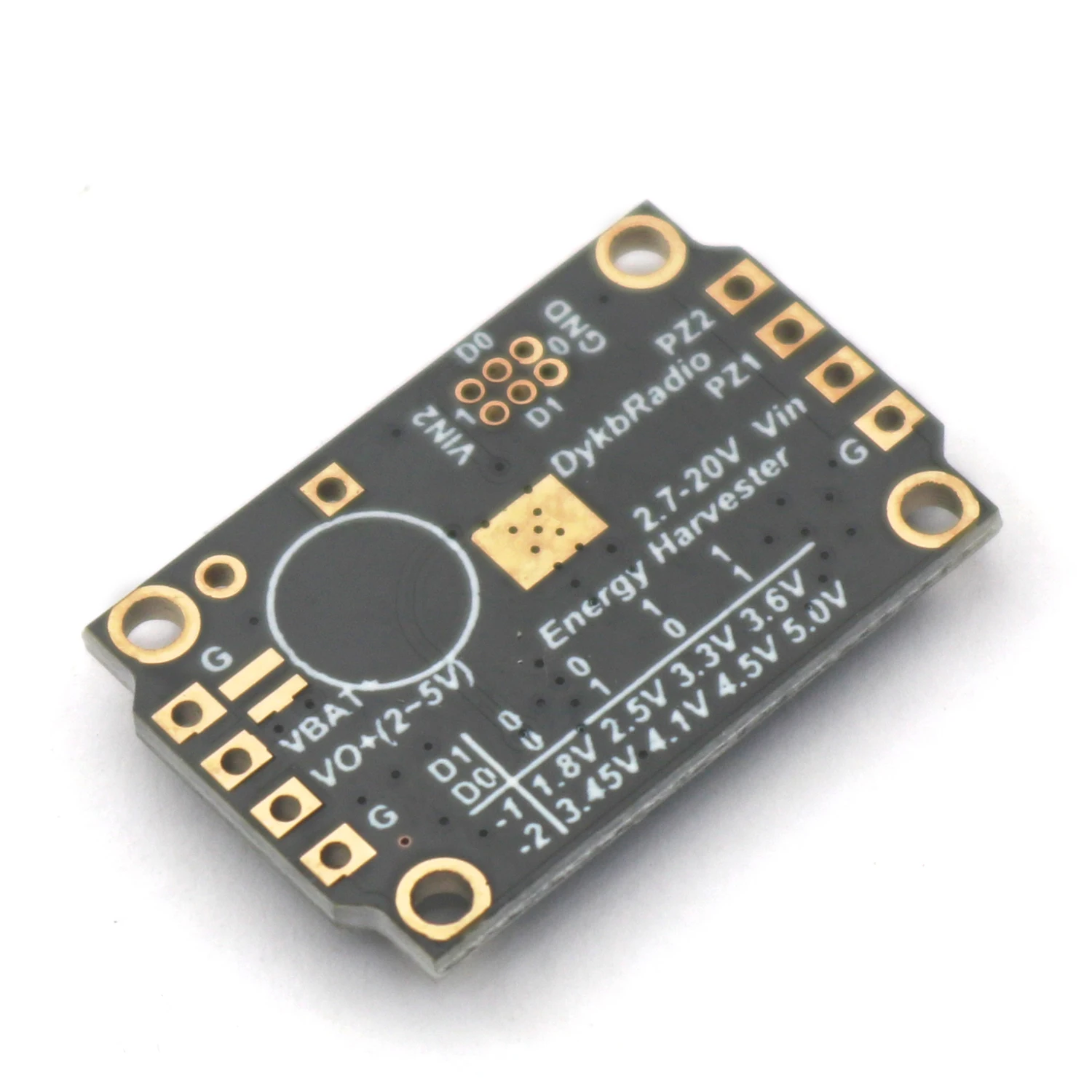 The LTC3588 Energy Harvester module is a compact, efficient piezoelectric energy harvesting power supply designed for DIY electronics projects. Featuring a 100mA output current and an adjustable output voltage range of 1.8V to 5.5V, it is compatible with capacitors and lithium batteries. Its input voltage spans from 2.7V to 20V, making it versatile for various energy sources. The black rectangular PCB showcases surface-mount components, with gold-plated mounting holes and high-quality pins, highlighted by vibrant orange relay and round yellow piezoelectric sensor components. This sleek, modern design offers a reliable solution for energy harvesting and power management applications.