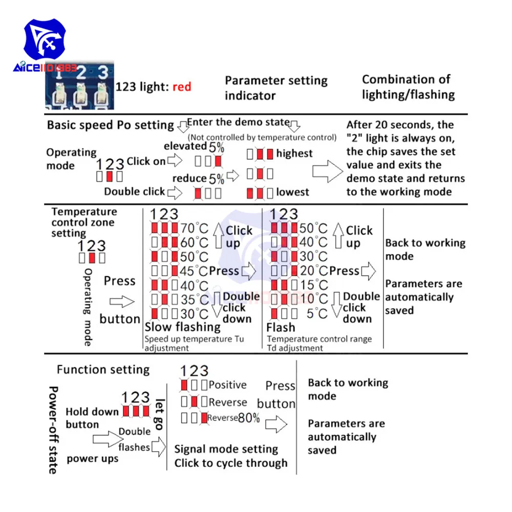 - Default settings include 20% speed control output, a 30°C acceleration temperature, and a 5°C temperature interval, all programmable for custom use.