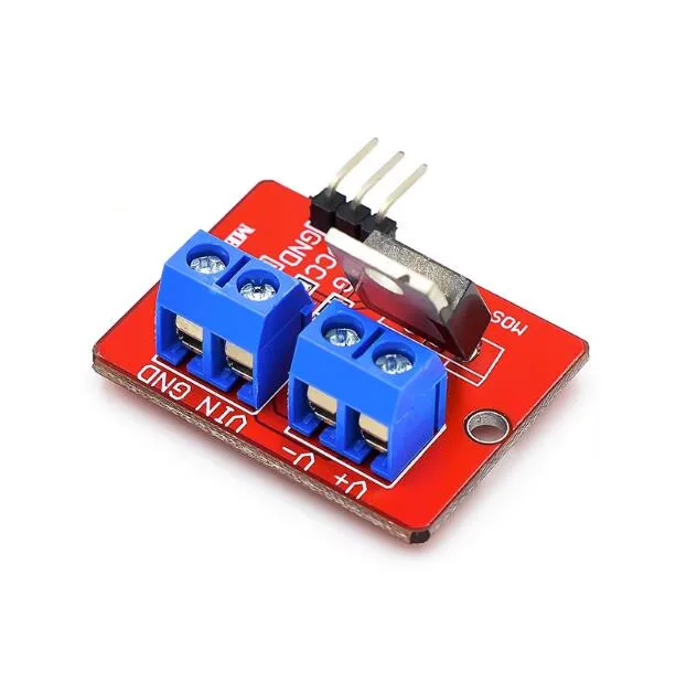 This compact MOSFET driver module measures 33.4 x 25.6 mm and operates within a voltage range of 3.3V to 5V, supporting load voltages up to 24V and currents below 5A—preferably with a heat sink for loads over 1A. Featuring an IRF520 power MOSFET, it enables precise PWM control for stepless dimming of LEDs and stepless speed regulation of motors. The module supports high-level (3.3V) and low-level (0V to 0.5V) control signals, making it ideal for microcontroller, ARM, and Raspberry Pi applications involving LED lighting, DC motors, micro pumps, and solenoid valves. Its sleek, industrial aesthetic combines functionality with a compact design.