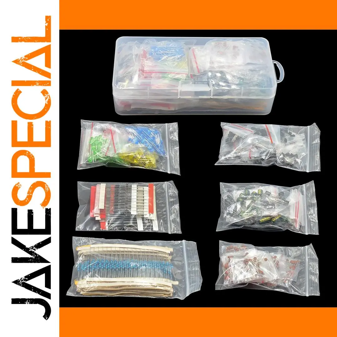 This comprehensive electronic components kit features 100 assorted LEDs in white, red, green, yellow, and blue with voltages from 1.8V to 3.2V and 20mA current ratings. It includes a 600-piece metal film resistor pack covering 30 values from 10Ω to 1MΩ with 0.25W power and 1% tolerance, a variety of electrolytic capacitors from 0.22μF to 470μF rated up to 50V, and ceramic capacitors ranging from 1pF to 100nF. The kit also contains a selection of common diodes including 1N4148, 1N4007, and SCHOTTKY diodes, as well as 170 transistors of NPN and PNP types with voltage ratings from 40V to 300V. Perfect for DIY electronics and experimentation.