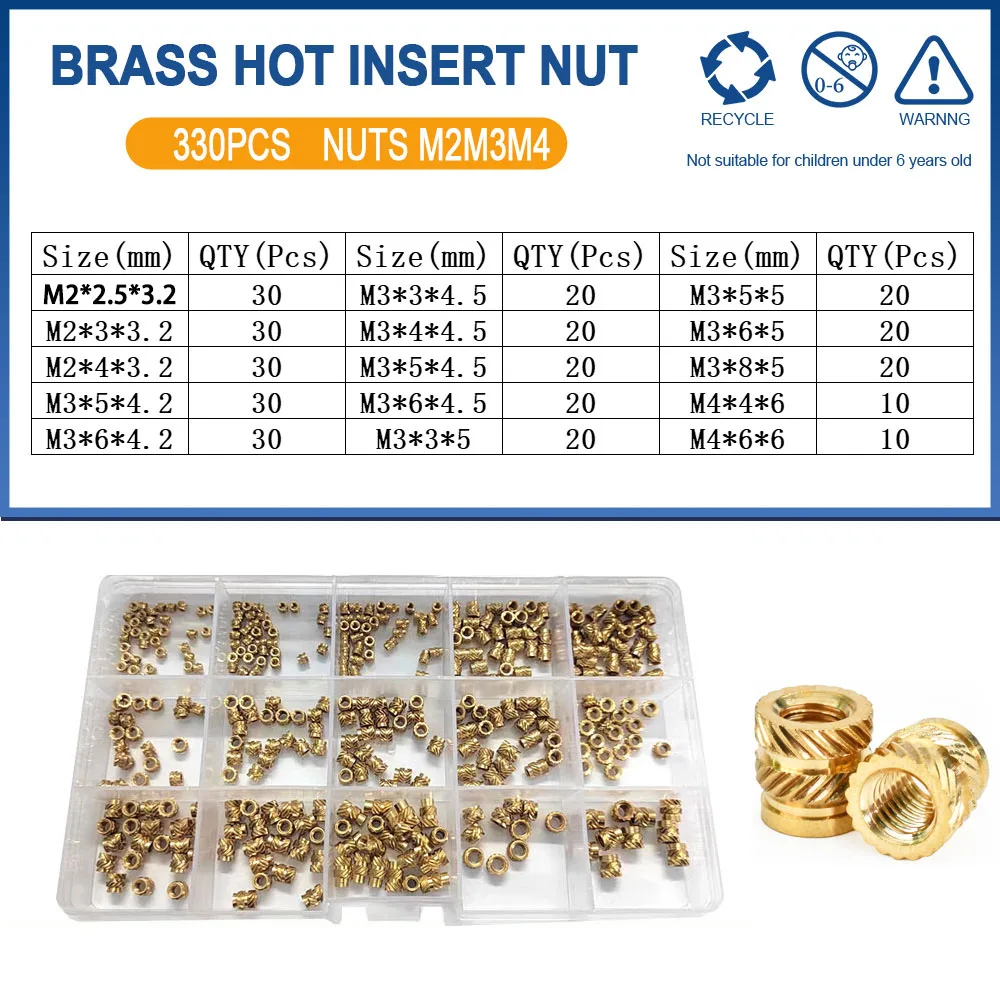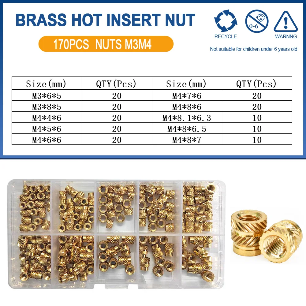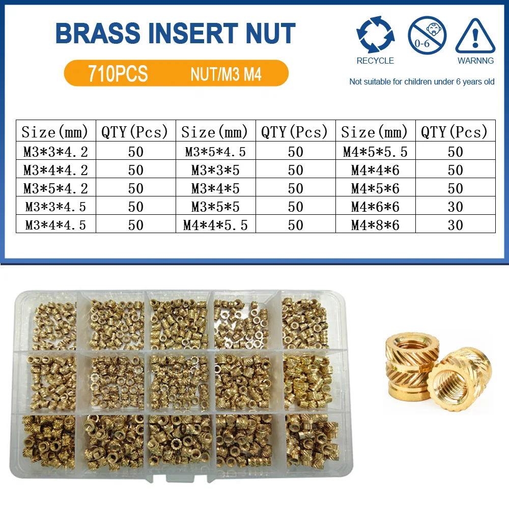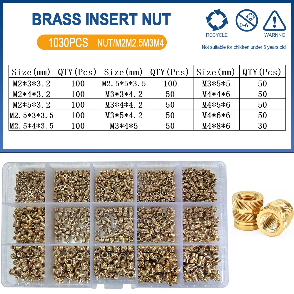 Discover the excellence of this Brass Insert Nut Kit, expertly designed for your electronics and 3D printing needs. Each component boasts a splendid gold finish, showcasing high-quality brass that combines aesthetics with functionality. The kit contains a variety of sizes: M2, M2.5, M3, M4, M5, M6, and M8, addressing diverse threading requirements efficiently. With versatile pack sizes, such as M3M4 with 710 pcs and M2M2.5M3M4 with a remarkable 1,030 pcs, you'll always have the right nut on hand for any project. Enjoy the convenience of an organized plastic container, where each compartment is distinctly labeled for easy access, making your project setup a breeze.