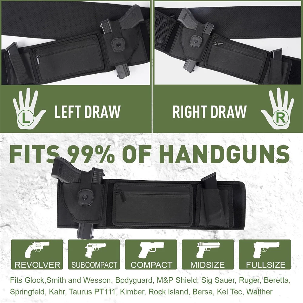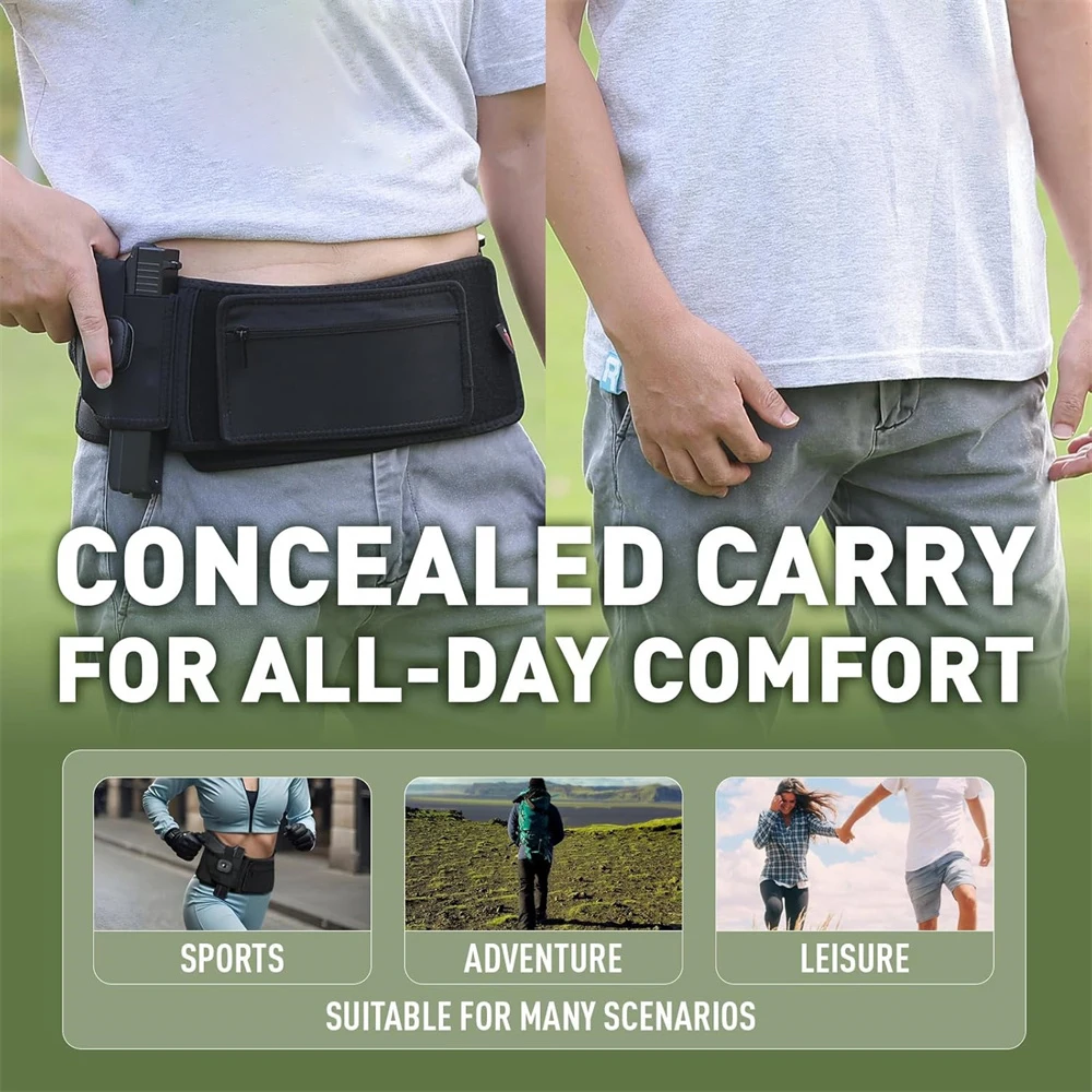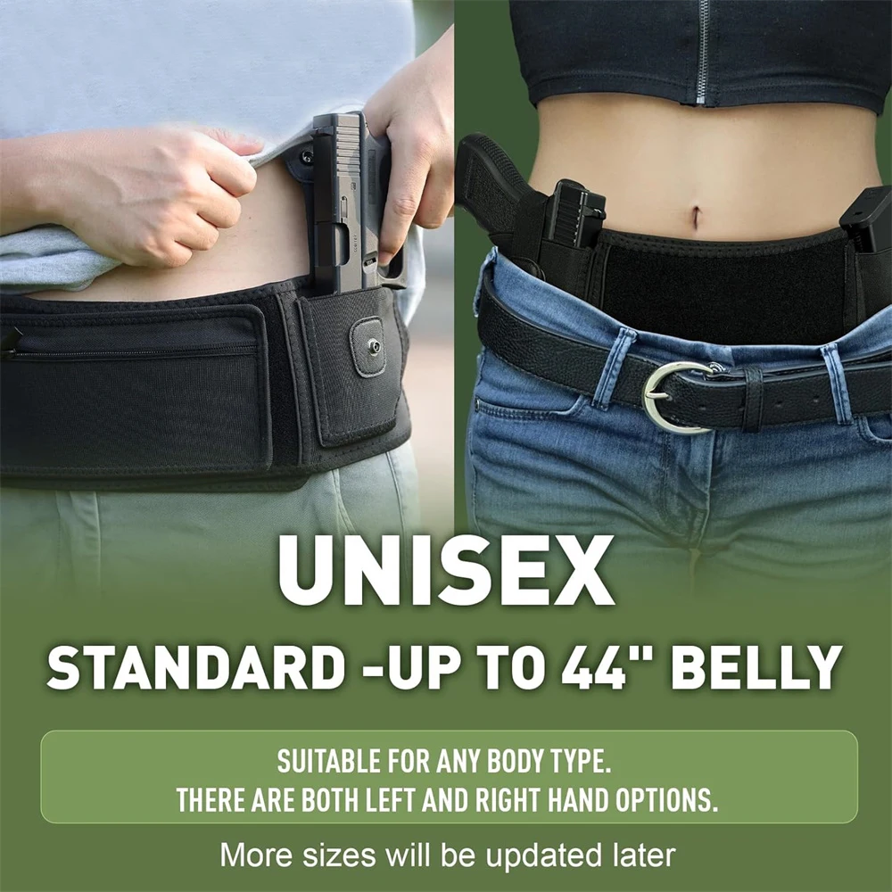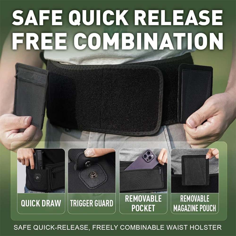 Experience the ultimate combination of security and comfort with this sleek, black belly band gun holster. Crafted from durable neoprene and breathable mesh, it ensures all-day ventilation and sweat-wicking performance while maintaining a lightweight profile of approximately 230 grams. Designed to fit waist sizes up to 44″ (medium) or 53″ (large), this holster adapts perfectly to your body, whether worn on the left or right side. Its minimalist yet functional design provides easy access to your firearm with safety features like a trigger guard and elastic retention snap strap. The inclusion of discreet compartments such as a zipper pouch and magazine pocket makes organizing accessories simple. Trust this holster to keep your firearm secure during sports, hunting, or daily activities, offering comfort and confidence throughout the day.