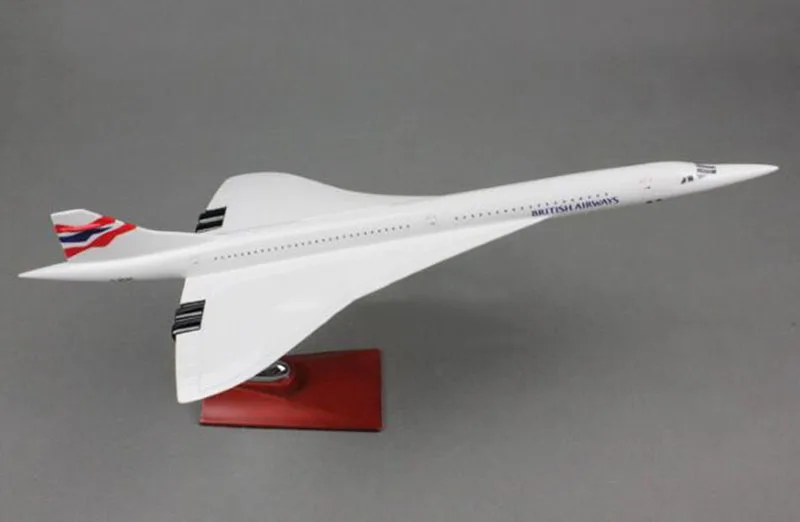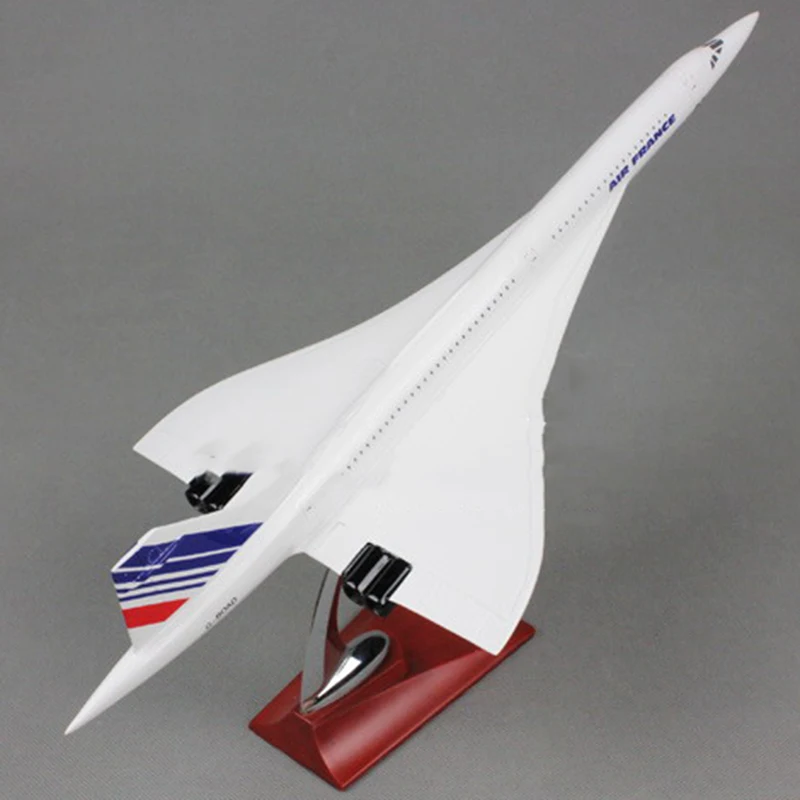 Discover the beauty of aviation history with this meticulously crafted scale model of the Concorde, measuring approximately 48 centimeters. Designed for display rather than flight, this diecast resin replica captures every detail of the iconic supersonic jet, from its slender fuselage to the delta wings and pointed nose. Whether you prefer the Air France livery or the British Airways design, each model features authentic color schemes with vibrant stripes on the tail fin and realistic branding along the fuselage. The glossy finish enhances the sleek, modern aesthetic, making it a striking centerpiece for aviation enthusiasts and collectors alike. Its elegant mounting on a polished metallic arm and wooden base adds a refined touch to your collection, perfect for showcasing in a display cabinet or office desktop.