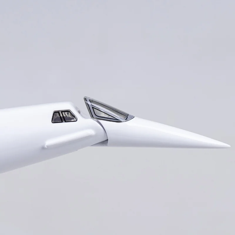 - The aircraft features a sleek, delta-wing design, with a sharply pointed nose and smooth fuselage, replicating the iconic shape of the legendary Concorde aircraft.