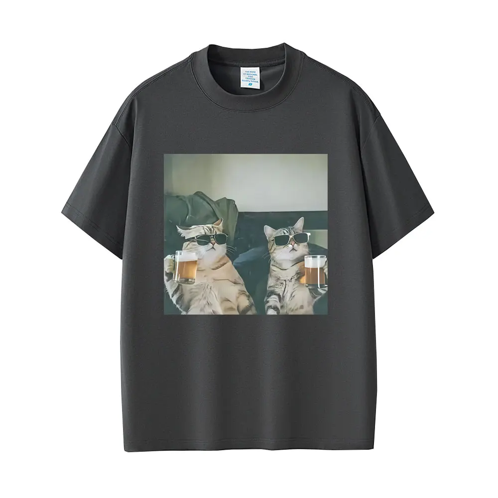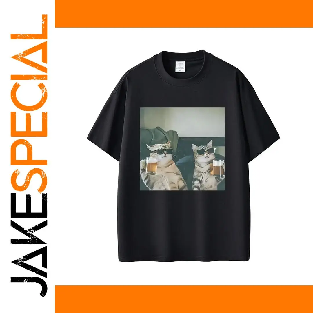 Imagine yourself sporting this trendy black T-shirt, featuring a bold graphic of two relaxed cats on a couch, wearing stylish sunglasses while enjoying beers. Crafted from breathable, lightweight cotton, it offers exceptional comfort year-round. Its vintage style and fun design make it perfect for casual outings or laid-back weekends. The classic crewneck and short sleeves provide a timeless look, while the detailed, realistic cats add a humorous touch your friends will love. You’ll feel confident showing off this playful yet fashionable piece that expresses your personality. Whether you're at a gathering, relaxing at home, or out with friends, this shirt makes a statement, blending humor, style, and comfort effortlessly.