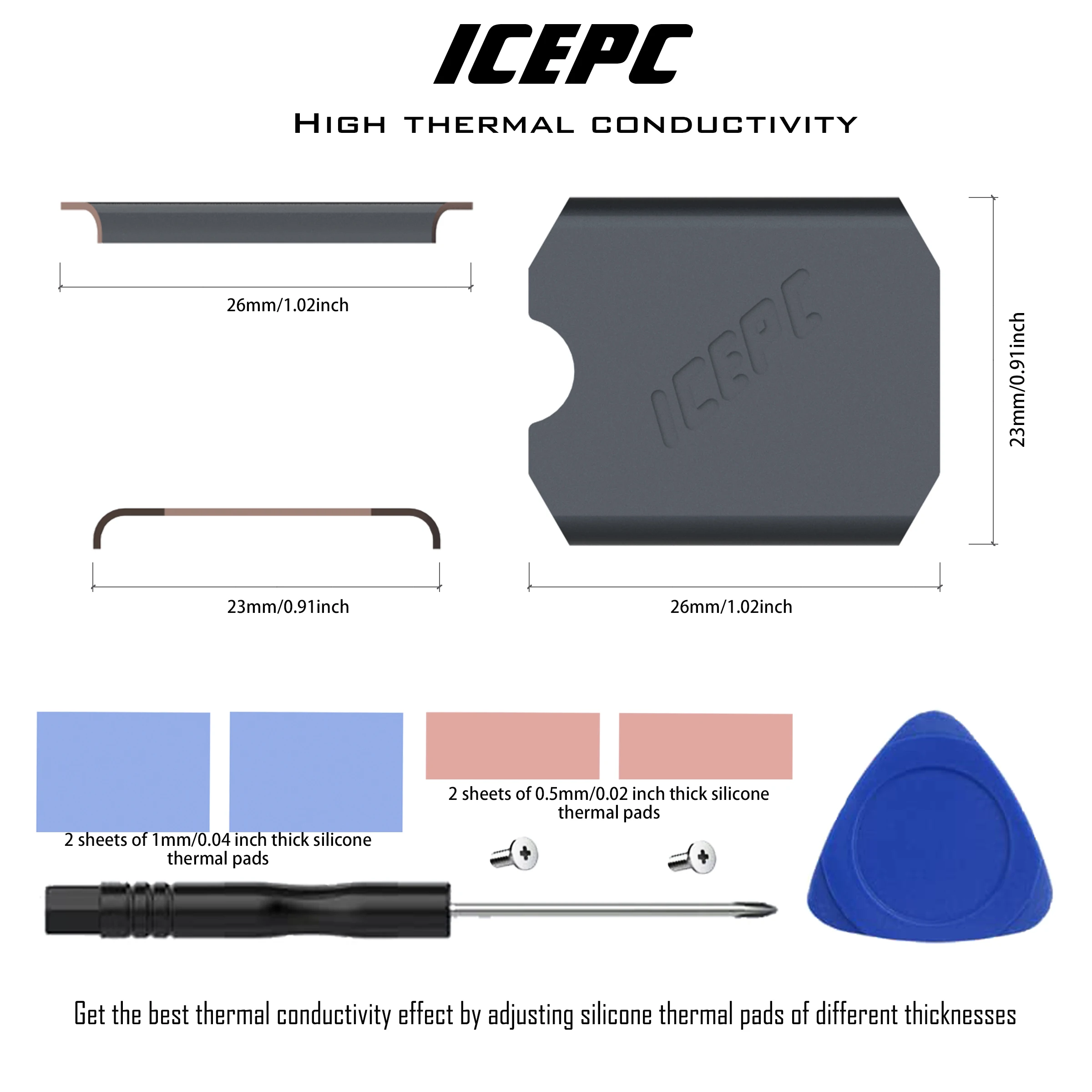 Experience optimal heat management with this high-performance heatsink, designed specifically for Steam Deck 2230 SSDs. Crafted from premium copper and graphene, it boasts a thermal conductivity of 5300 W/m-k, ensuring rapid heat dissipation to prevent overheating and performance throttling. Its compact rectangular shape measures just 26x23mm, with a minimalist, smooth-edged design that seamlessly fits into tight spaces. The subtle matte finish and engraved “ICEPC” branding add a refined touch. Lightweight at only 15 grams, this heatsink offers an efficient cooling solution that keeps your SSD running at a safe temperature of 20-35°C. Its included accessories make installation straightforward and secure for long-lasting durability.