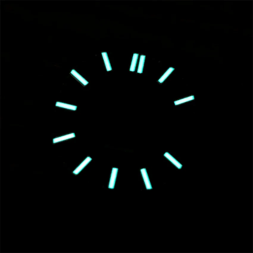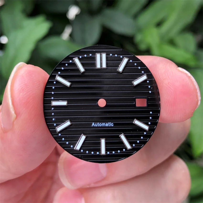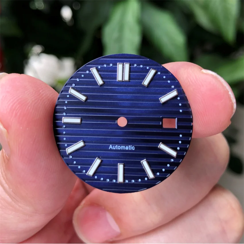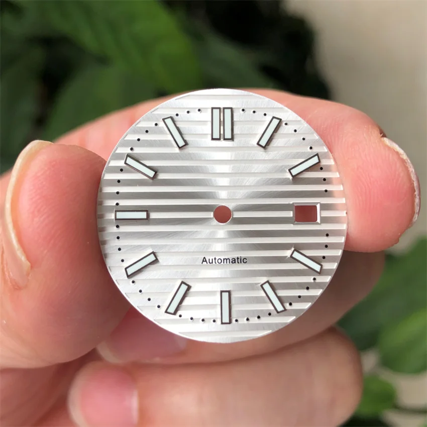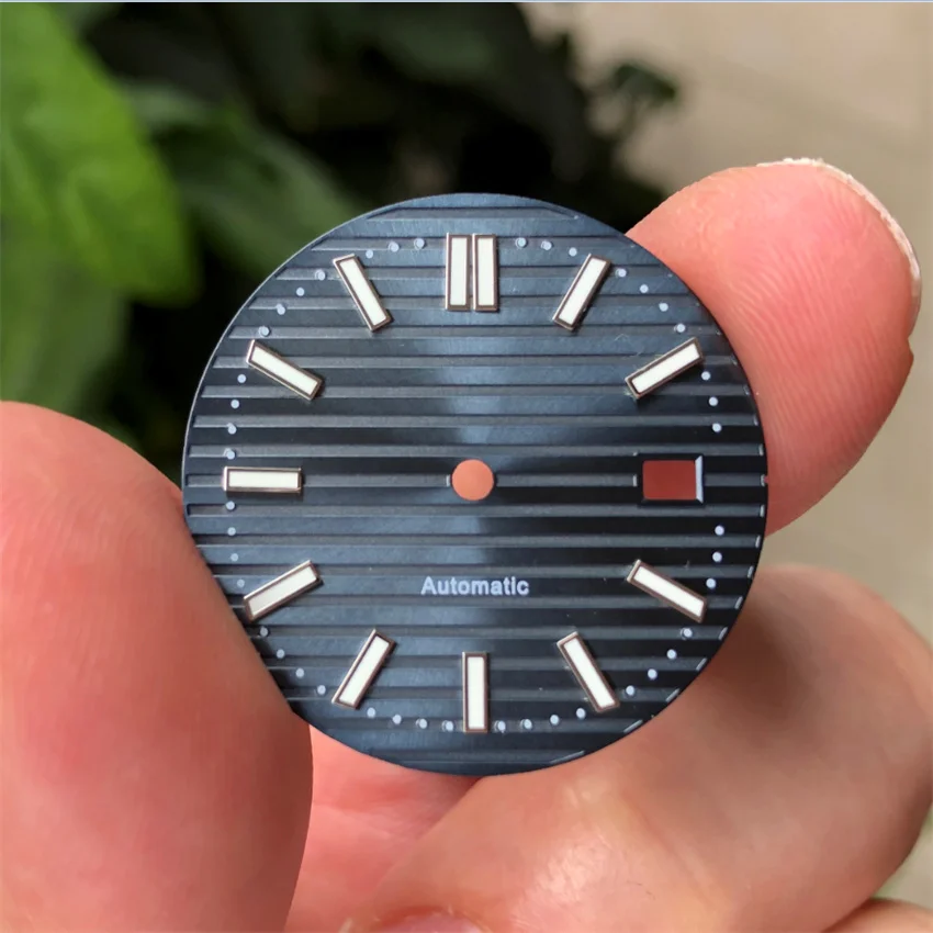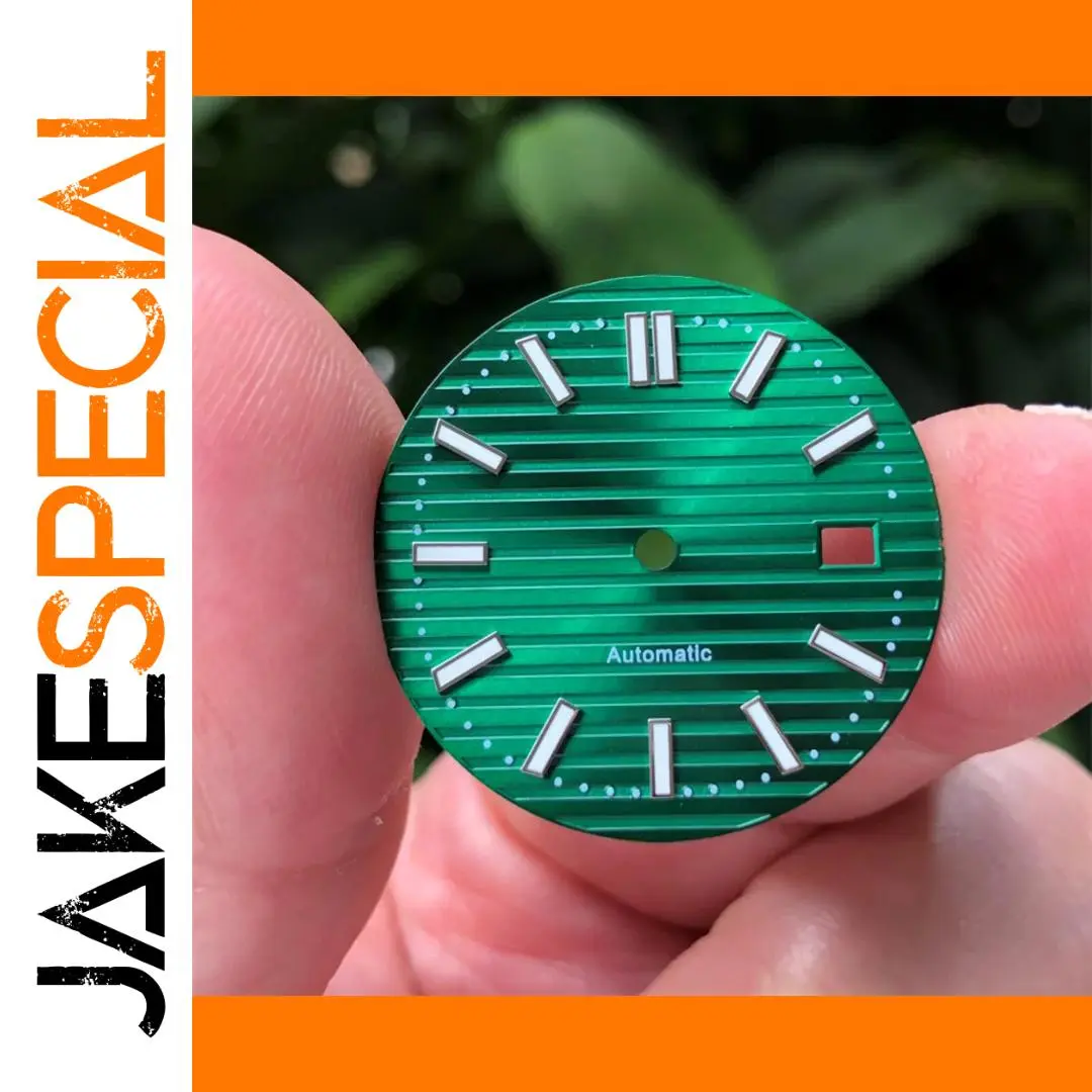 Imagine elevating your men's mechanical watch with this exquisite 30.5mm copper dial. Its deep green, glossy finish draws the eye, complemented by textured horizontal ridges for a striking striped look. Prominently positioned rectangular hour markers in white with silver outlines offer bold clarity, with larger markers at 3, 6, 9, and 12 o'clock adding balanced emphasis. A small square date window outlined in white and accented with a red background adds subtle color contrast. Designed as a precision repair part, this dial seamlessly fits ETA2824 and PT5000 automatic movements. Its slim profile at just 0.4mm thickness keeps the watch sleek, while its 15g weight ensures quality without bulk. Perfect for customizing or restoring a high-end mechanical timepiece.