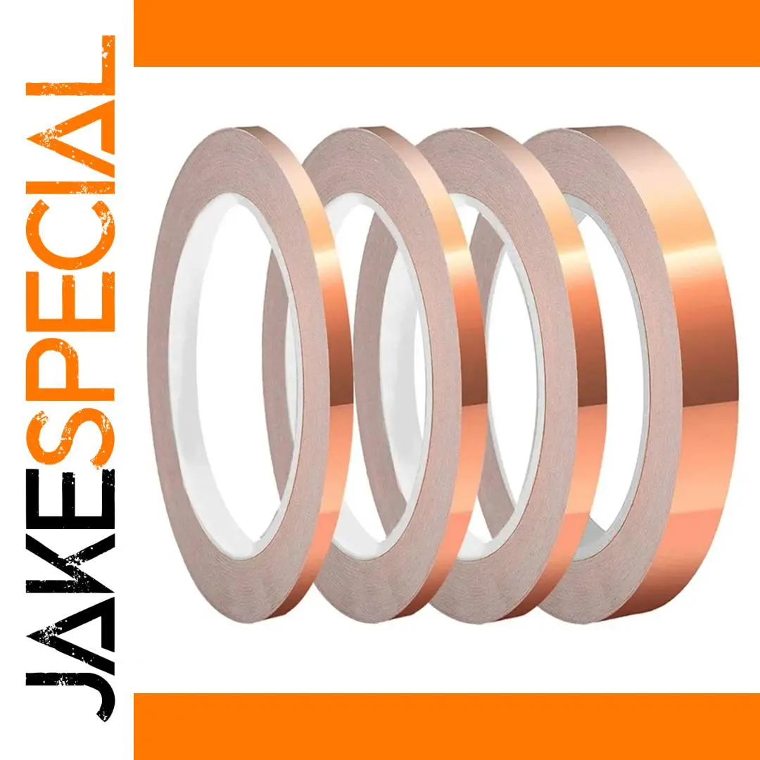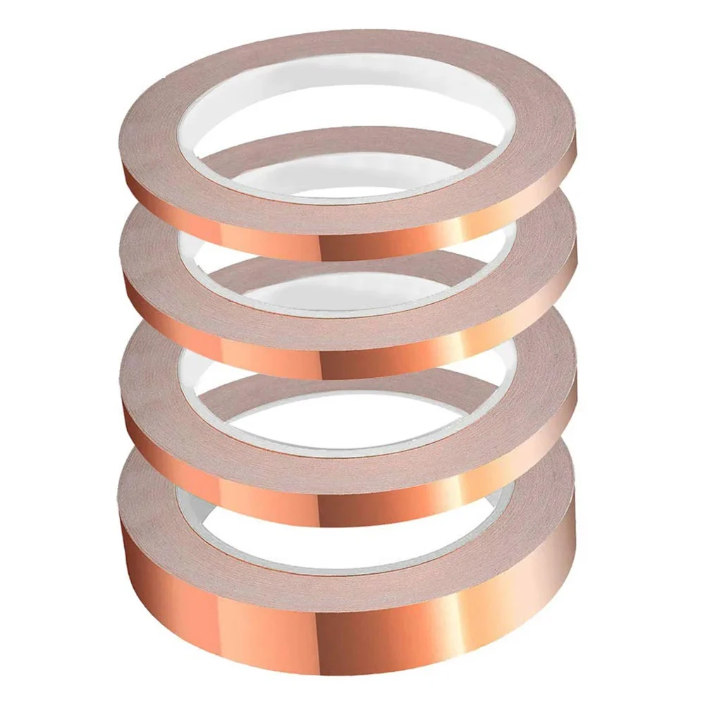 This high-quality, single-sided copper foil tape measures approximately 20 meters in length with a thickness of 0.5mm and is available in widths of 3mm, 5mm, 6mm, 8mm, and 10mm. It features an adhesive force of 1.2 to 1.4 kg per 25mm, withstanding temperatures from -10°C to 140°C. The tape offers excellent EMI shielding, making it ideal for shielding guitar pickguards and cavities, repairing copper traces on printed circuit boards, and applications in transformers, smartphones, PCs, LCDs, and copiers. Its smooth, reflective copper surface combines durability with a sleek, industrial aesthetic, perfect for detailed DIY projects and electrical repairs.