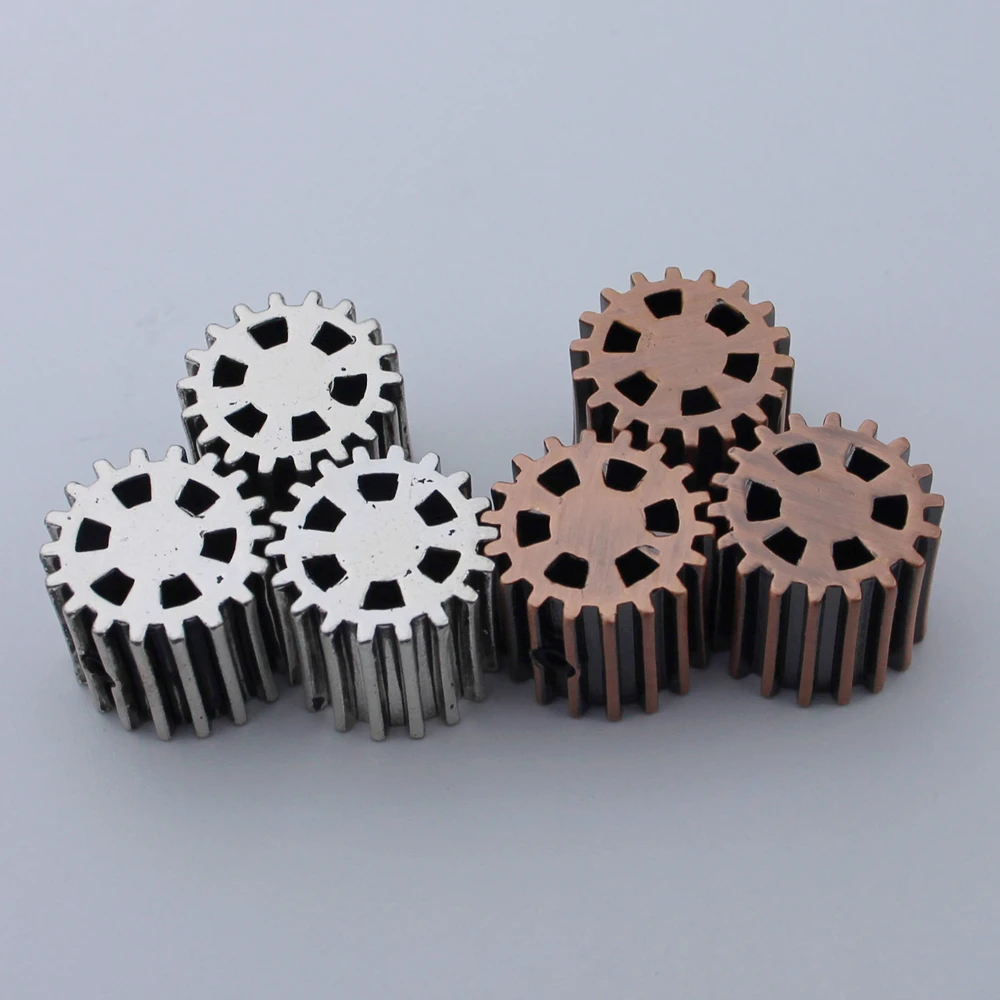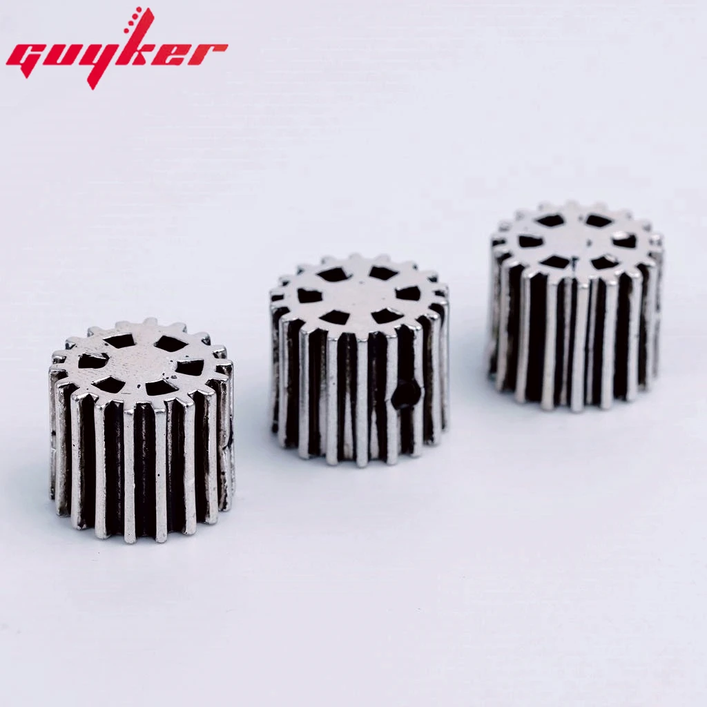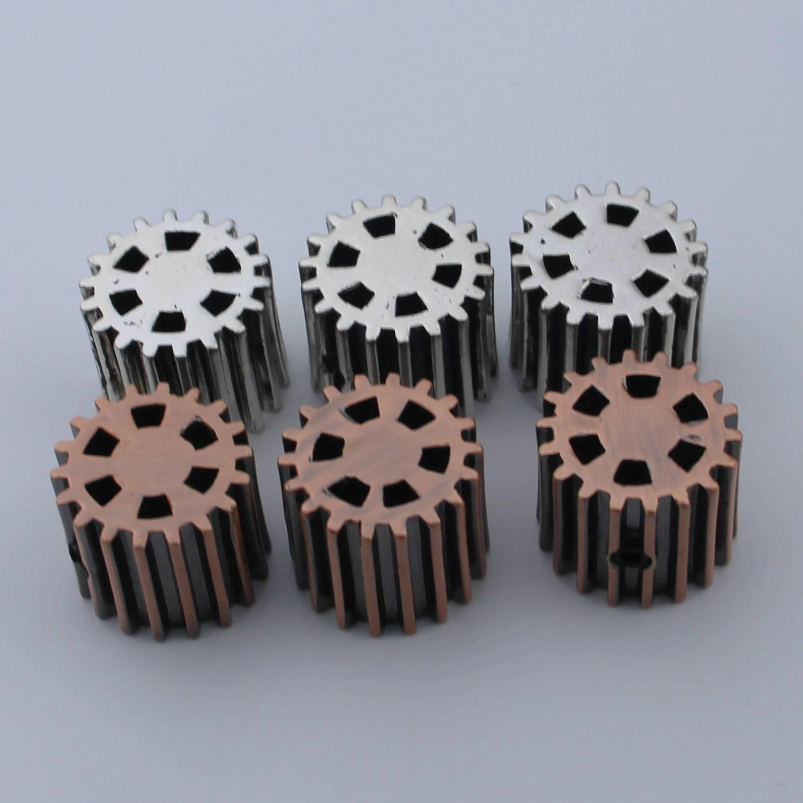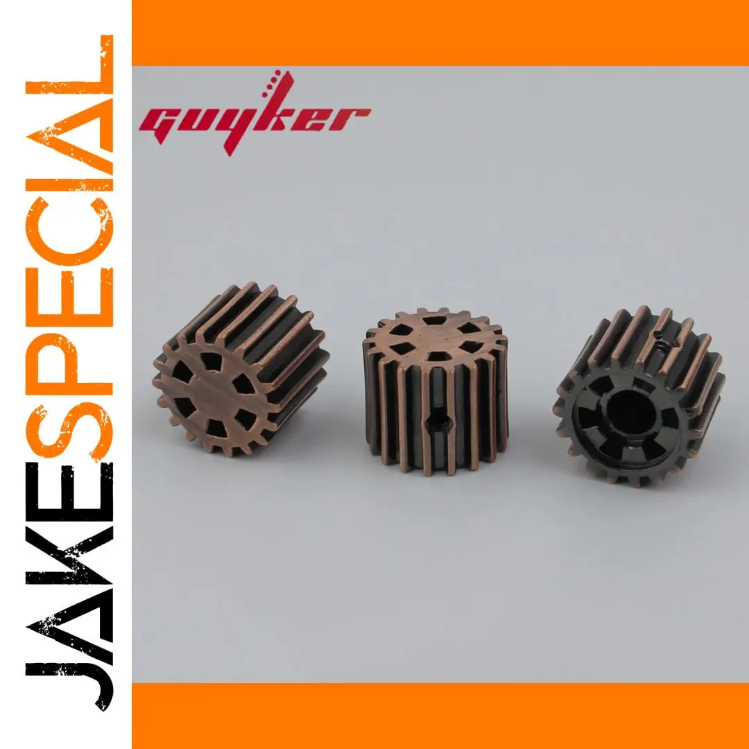 Imagine elevating your electric guitar or bass with this stunning gear knob, crafted from high-quality copper. Its warm metallic brown finish, combined with dual-color options—black (ANCR) and red (BR)—creates a striking contrast that complements your instrument’s aesthetic. The knurled, textured exterior with evenly spaced vertical fins ensures a firm grip during performances or practice sessions. The intricate top surface, featuring small triangular cutouts arranged in a circle around a solid center, adds a decorative touch of geometric elegance. Designed with precise compatibility, these knobs fit standard potentiometer shafts, including a visible black internal core, which hints at their functional and durable construction. Transform your instrument’s look with this elegant, reliable control accessory.