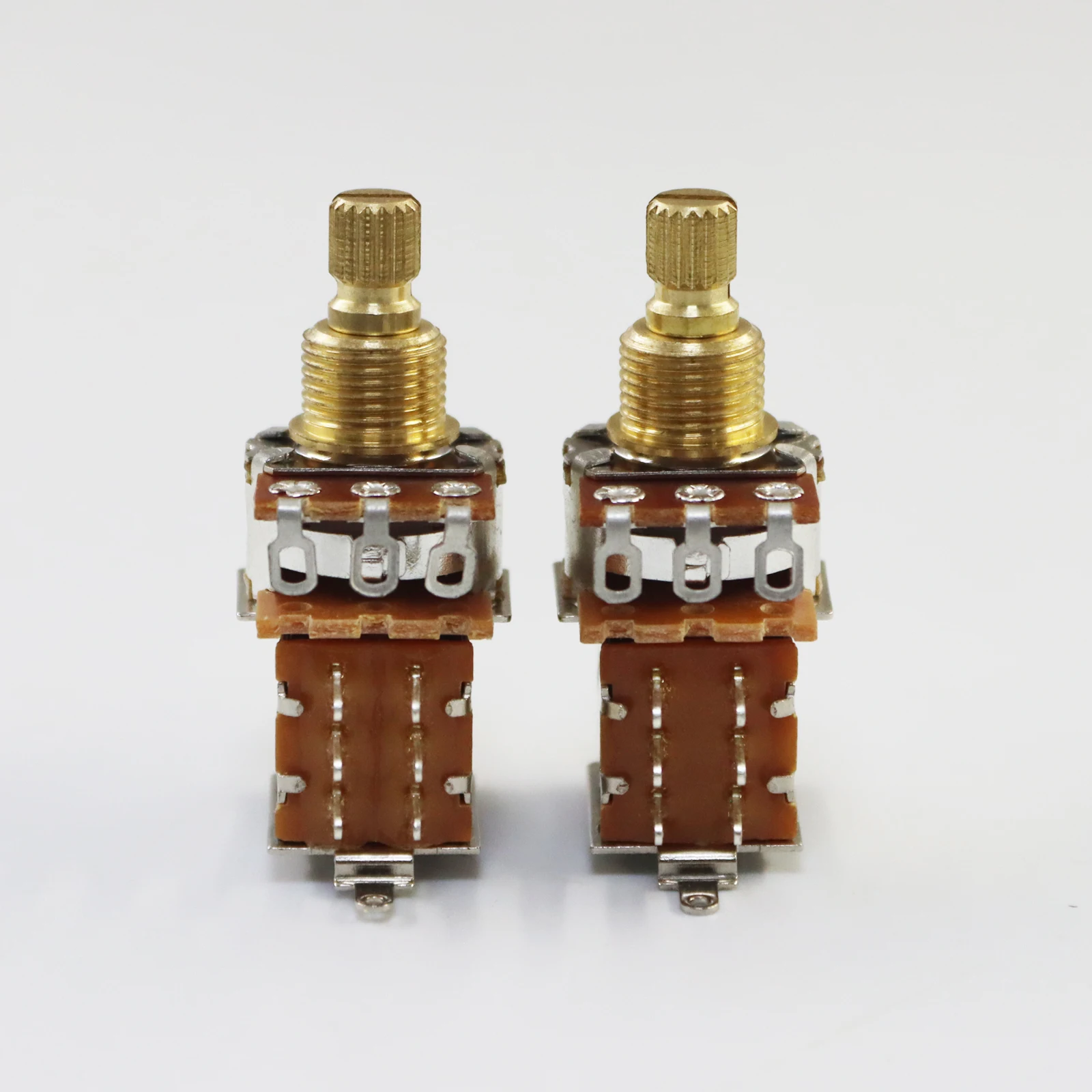 Experience the perfect blend of vintage style and modern precision with this set of two copper potentiometers, expertly designed for guitar and bass controls. Featuring a sleek metallic finish, these potentiometers exude industrial elegance, highlighted by the gold switches and knurled brass shafts. The short 6mm shafts with textured grips ensure comfortable and precise adjustments, while the durable construction guarantees long-lasting performance. With resistance options of 250K ohms or 500K ohms, these pots allow for seamless compatibility with single or dual coil pickups. Whether you're upgrading your instrument or building from scratch, these components enhance both functionality and aesthetics, giving your guitar a refined, professional look and feel.
