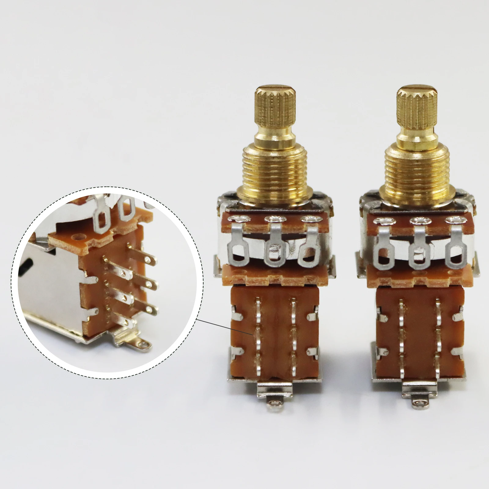 Imagine the enhanced control and professional look your guitar will have after installing these high-quality potentiometers. With their rugged construction and precise specifications, you'll enjoy smooth, reliable tuning and switching. Whether you are refurbishing an existing instrument or building a custom setup, this set offers the versatile resistance options and functional features necessary to refine your tone. Invest in these dependable components and experience the satisfaction of an expertly crafted, aesthetic upgrade that perfectly blends style and performance, designed to meet the demands of serious musicians and enthusiasts alike.