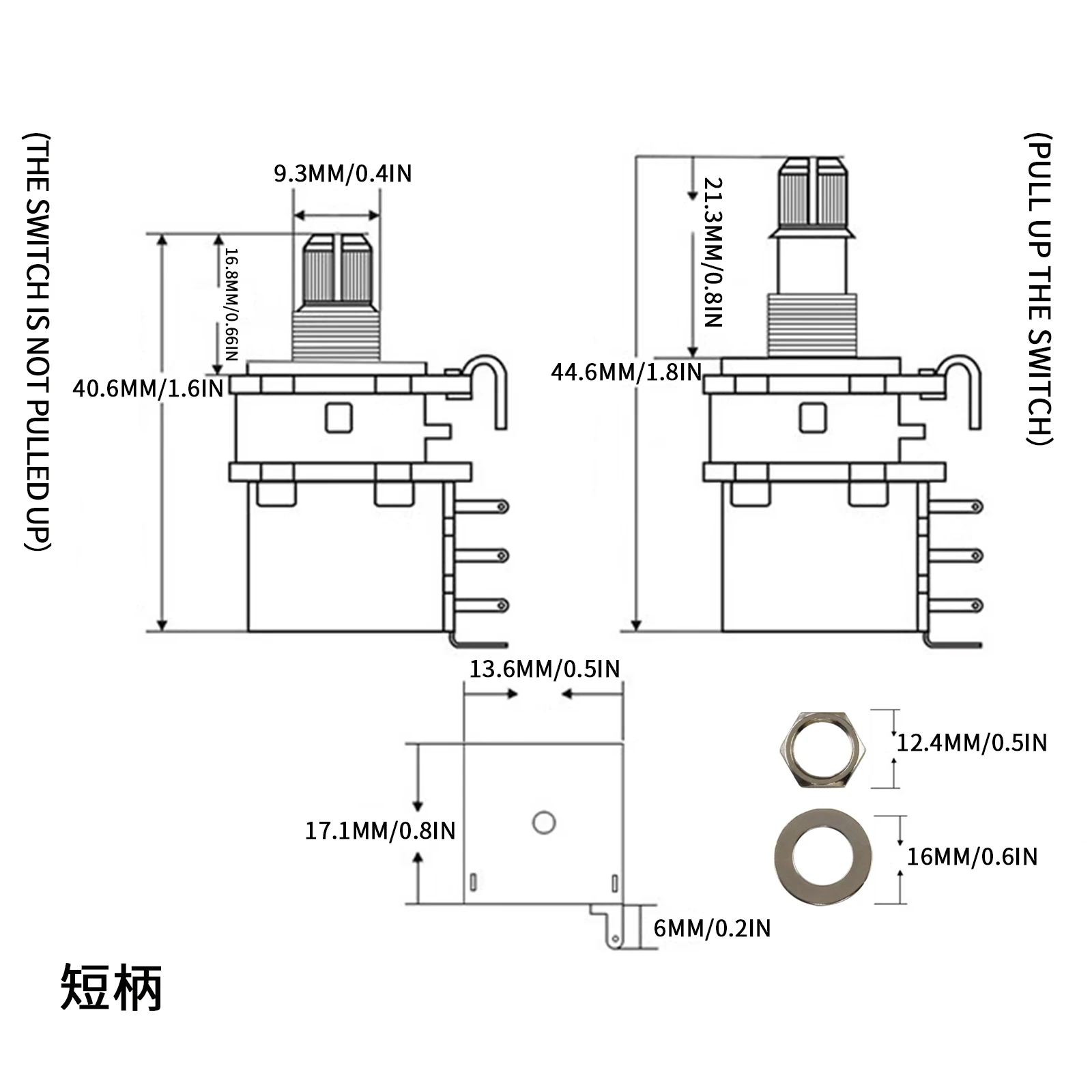 - Base dimensions of 13 x 17mm, with a rod length of approximately 15.5mm that extends 4mm when pulled, ideal for customizing your instrument's wiring and electronics.