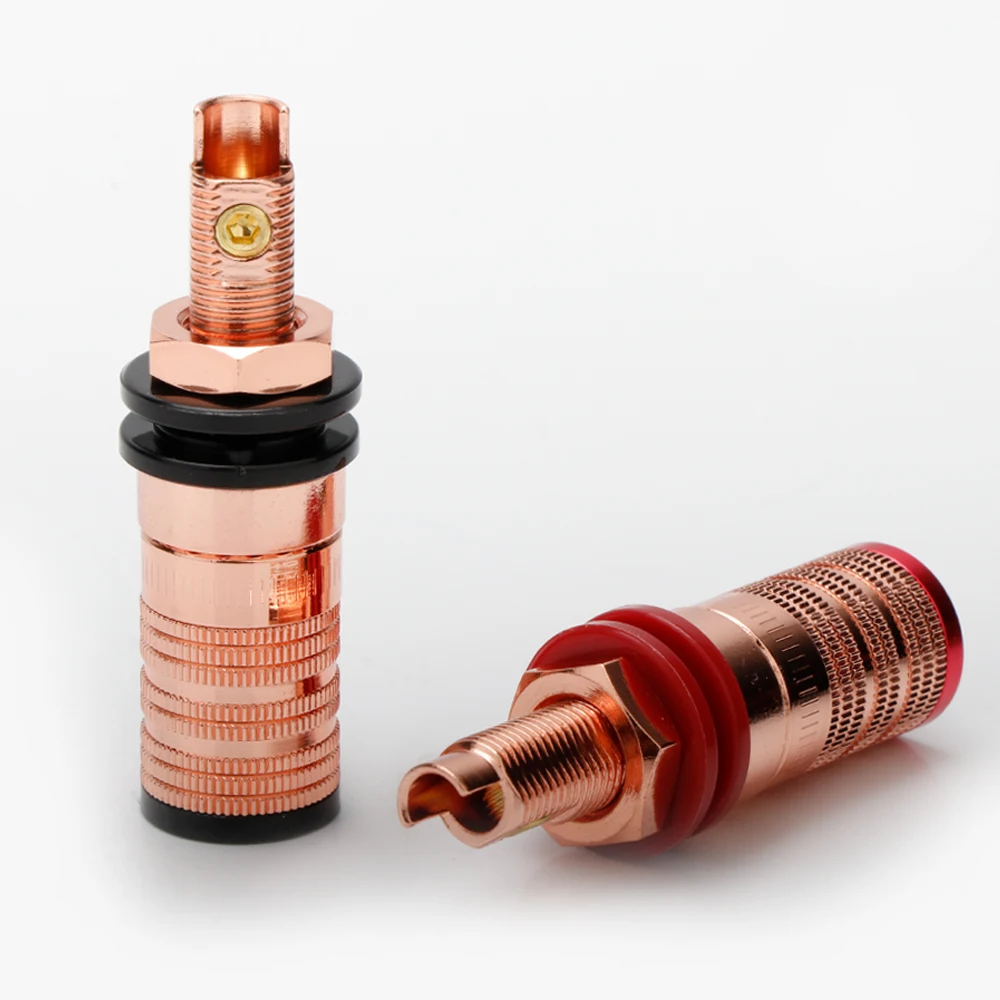Experience premium audio connectivity with this high-quality copper-plated binding post, designed for discerning audiophiles. Crafted from durable brass with a glossy copper finish, these binding posts combine aesthetic appeal with exceptional conductivity. Their cylindrical shape features finely grooved sections, providing a secure grip during installation. The black rubber or silicone washers and O-rings offer insulation and sealing for enhanced durability. Ideal for high-fidelity audio systems such as amplifiers, CD players, and DVD players, these binding posts ensure stable, noise-free connections. Whether you're upgrading your home audio setup or building a custom hi-fi system, these binding posts provide reliable performance and a sleek appearance, elevating your listening experience with a touch of sophistication and technical precision.