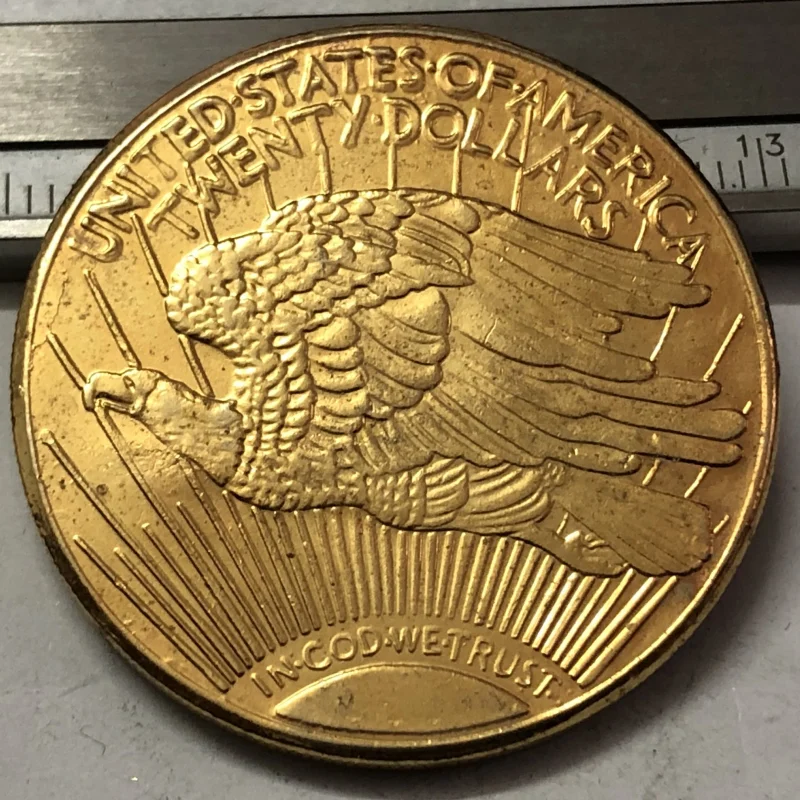 Experience the timeless beauty of this handcrafted copper replica of the 1921 US Saint-Gaudens 0 Gold coin. Featuring an antique US-style finish, it captures the intricate details of the original design with a warm, aged golden hue. The obverse displays Lady Liberty walking forward, draped in flowing robes, holding a torch and branch—symbols of enlightenment and peace—while her hair flows dynamically, suggesting motion. Radiating lines extend behind her, creating a striking visual effect. The coin’s border, decorated with small, evenly spaced stars, encircles the inscription “LIBERTY” at the top and the year “1921” at the bottom. Its textured, vintage surface with polished highlights offers a stunning display piece rooted in classic American numismatic artistry.