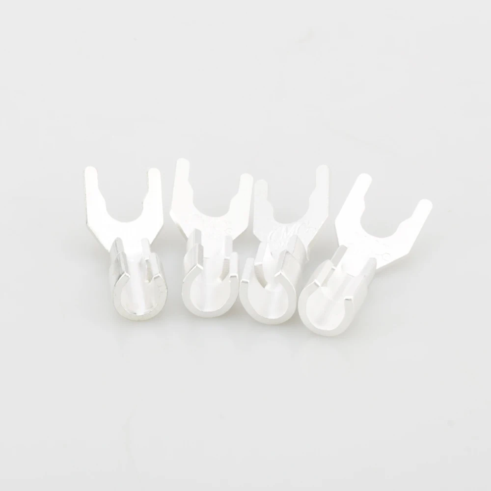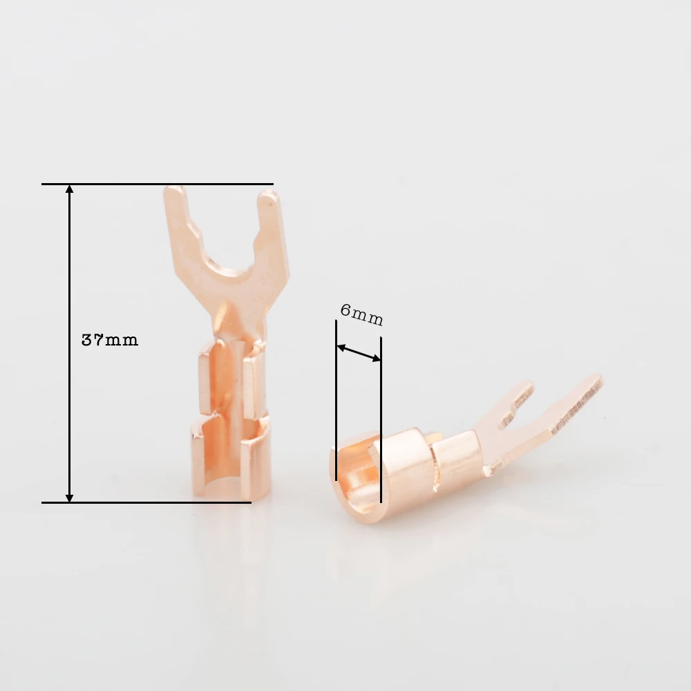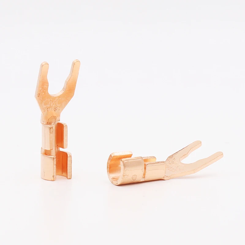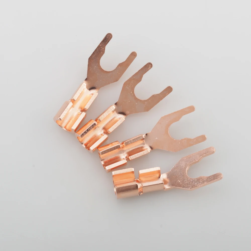 Envision upgrading your audio system with this set of high-performance Y spade connectors. Crafted from pure copper and finished with a durable silver plating, these connectors ensure excellent electrical conductivity and reliable connections. Designed for DIY audio enthusiasts, each connector supports cable diameters up to 5.5mm, providing versatility for various speaker wire setups. Their sleek, polished rose gold appearance reflects quality craftsmanship. The rectangular bases are slightly angled for easy attachment, featuring a flat, wide, tapered U-shaped fork prong at the top for secure terminal connections. Whether you solder or press-fit, these connectors promise durability and optimal sound quality over time. Enhance your audio experience now.