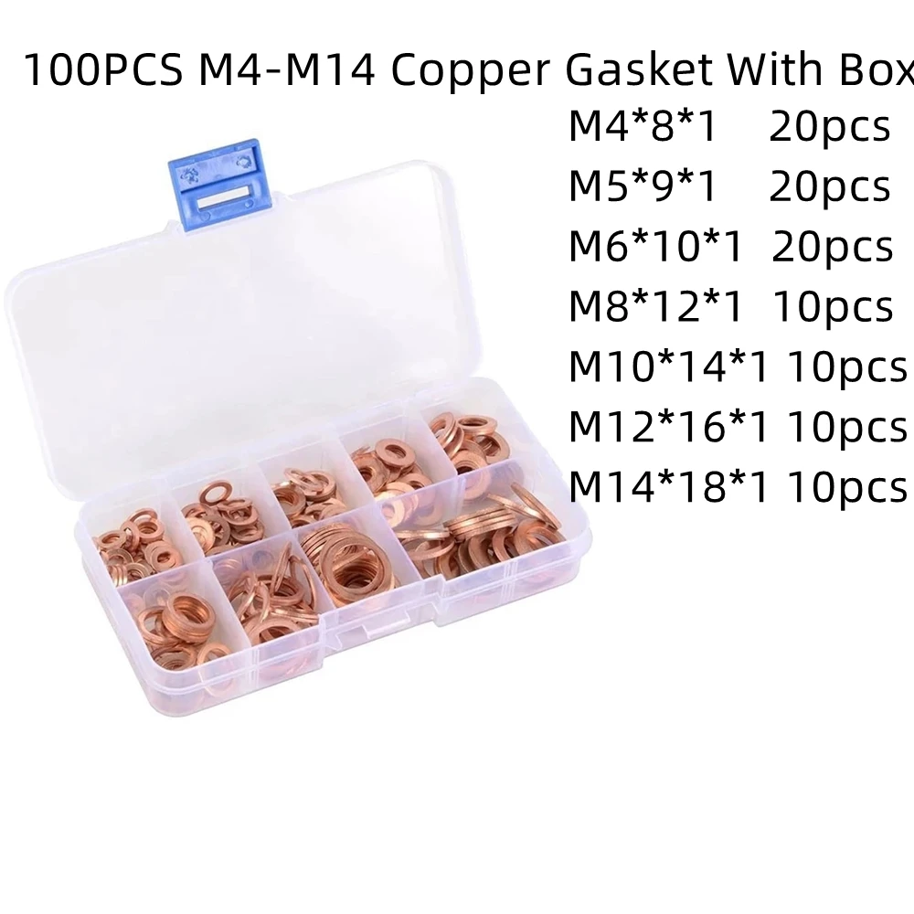 - 100-piece copper washer set featuring sizes M4 to M14, with 20 pieces each for M4, M5, and M6, and 10 pieces each for M8 to M14, ensuring a comprehensive collection for various tasks.