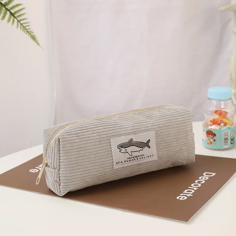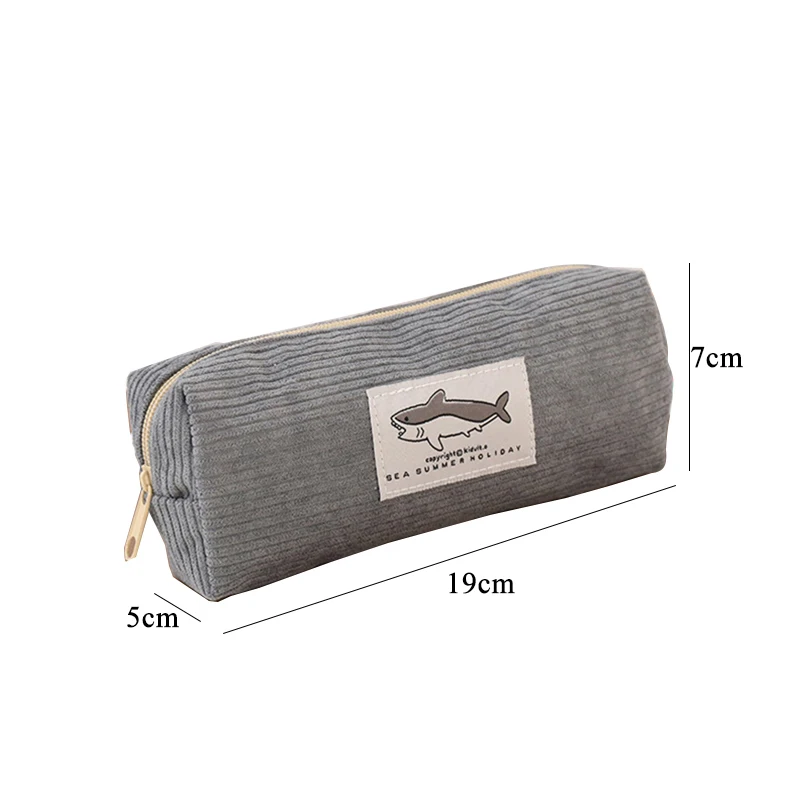 Experience the perfect blend of style and functionality with this delightful Corduroy Pencil Case. Designed for both students and professionals, this pencil pouch comes in a charming assortment of colors: light gray, dark gray, pastel green, and beige. Its soft ribbed corduroy fabric ensures a unique texture while maintaining durability, making it ideal for everyday use. With ample space measuring approximately 19 cm in length, 7 cm in width, and 5 cm in height, your essential stationery items are effortlessly stored and readily accessible. Featuring an adorable shark graphic label with the phrase “SEA & SURFING HOLIDAY,” this case adds a touch of whimsy to your academic or office supplies.