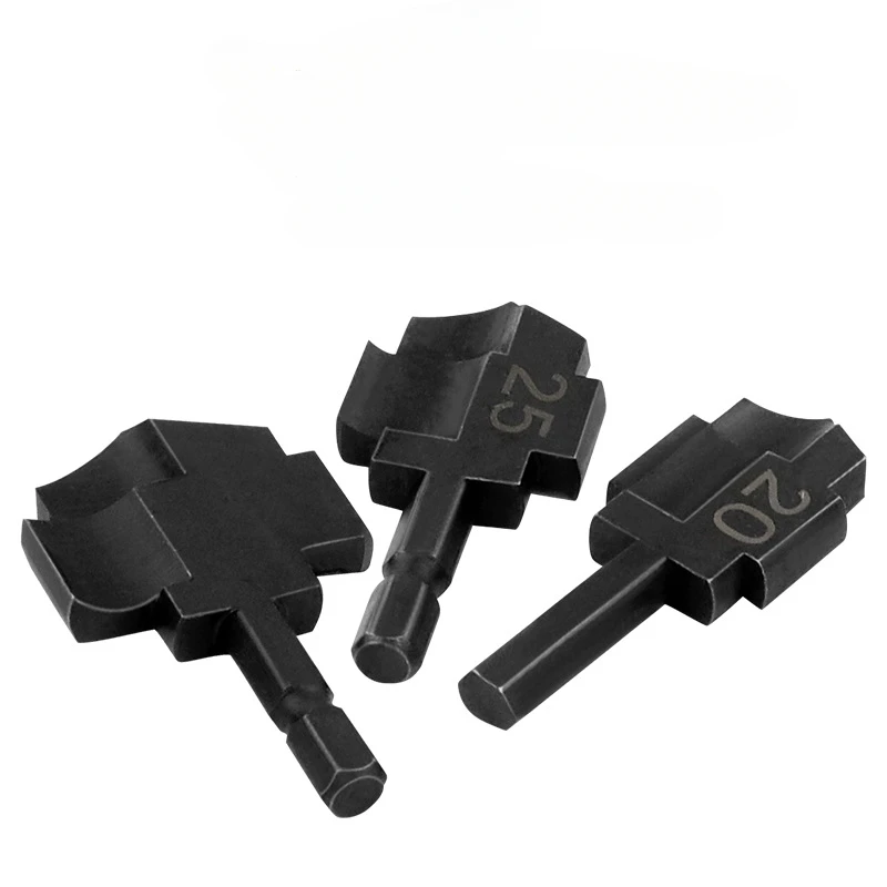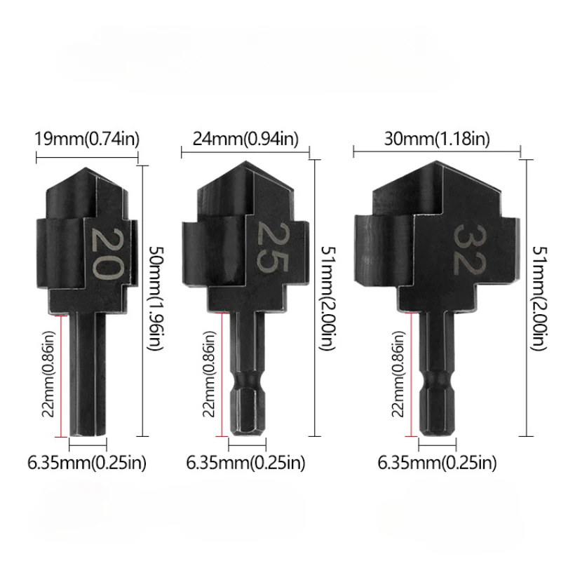 This set of three core drill bits is essential for any plumbing enthusiast or professional, featuring sizes 20mm, 25mm, and 32mm, specifically tailored for tapping and repairing PPR water pipes. Constructed from high carbon steel, each bit showcases a dark, metallic finish with a matte texture, ensuring both durability and a rugged appearance. The flat, hexagonal shank allows for seamless compatibility with a variety of power tools, while the truncated cone design of the heads optimizes performance during core drilling tasks. You'll find size markings etched in a contrasting color, making it easy to select the right bit for your project.
