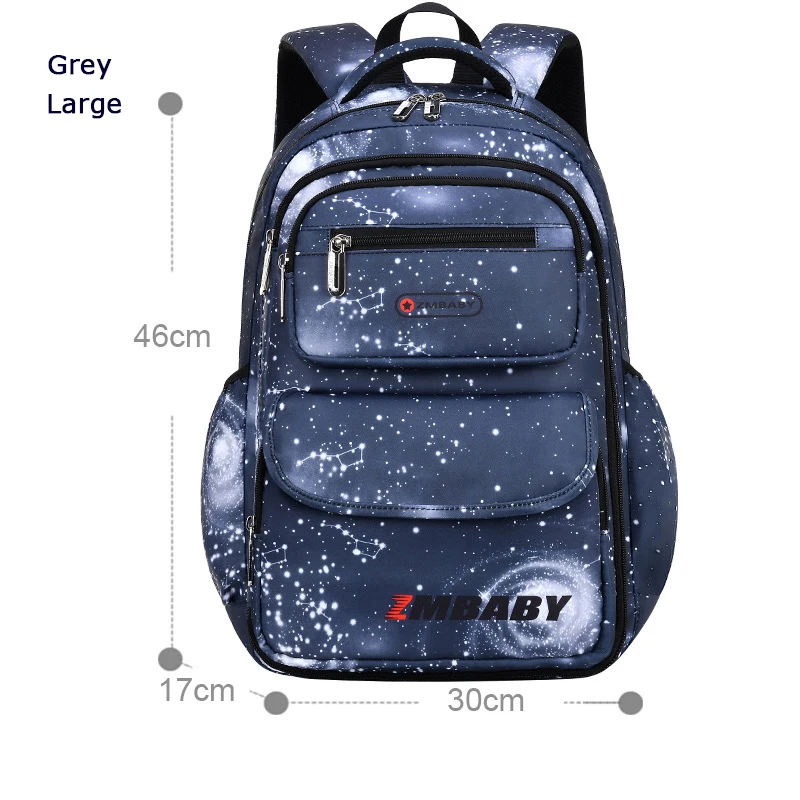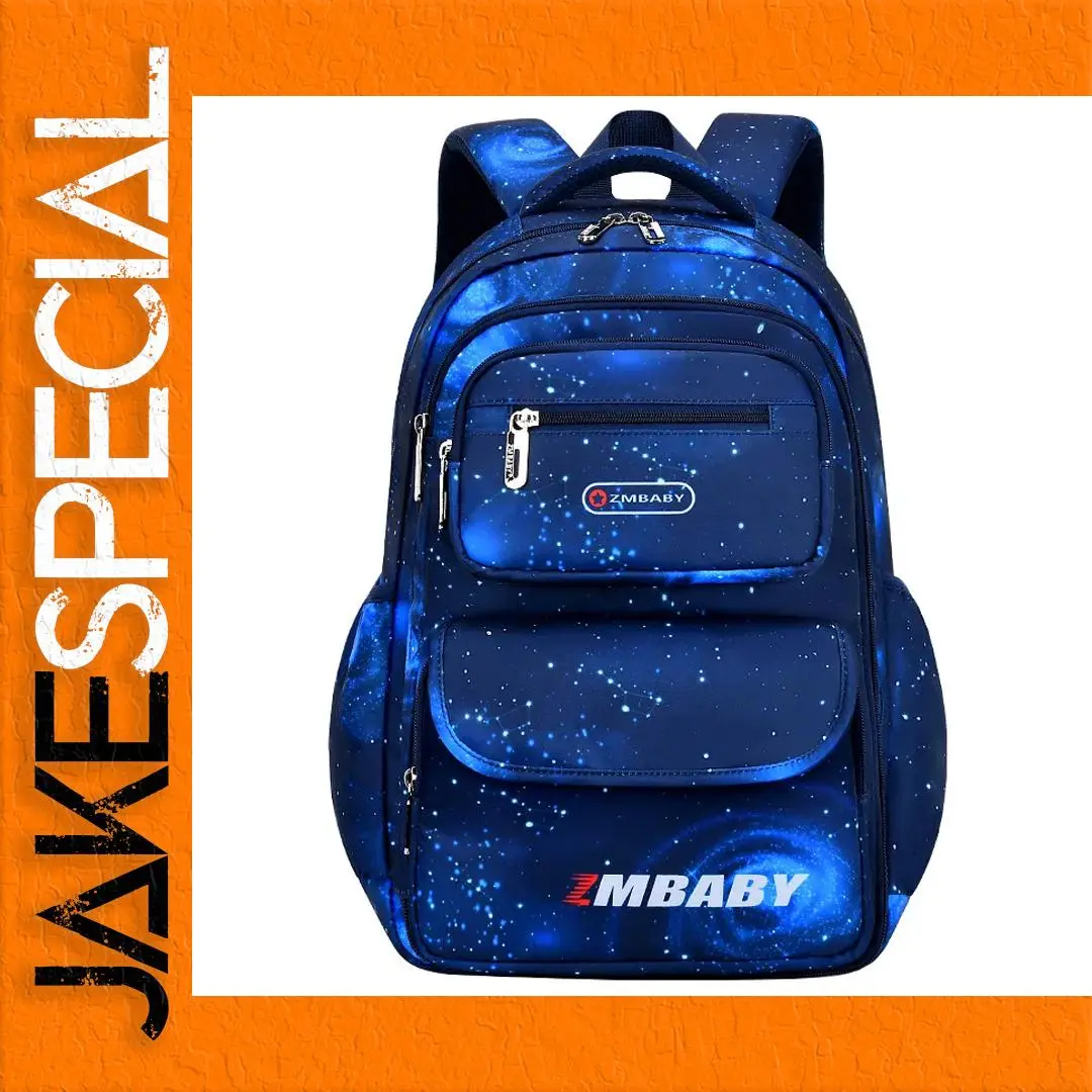 This children's orthopedic school backpack is designed for both boys and girls, merging style with functionality for everyday school use. The backpack features a striking navy blue exterior enhanced by a cosmic design with stylized blue and white stars and nebula-like patterns, bringing the universe to life for your child. Crafted from waterproof nylon, it ensures durability against the elements and everyday wear. With dimensions of 46 cm in height, 30 cm in length, and 17 cm in width, it is spacious yet lightweight at just 0.7 kg, perfect for carrying books and school essentials securely and comfortably.