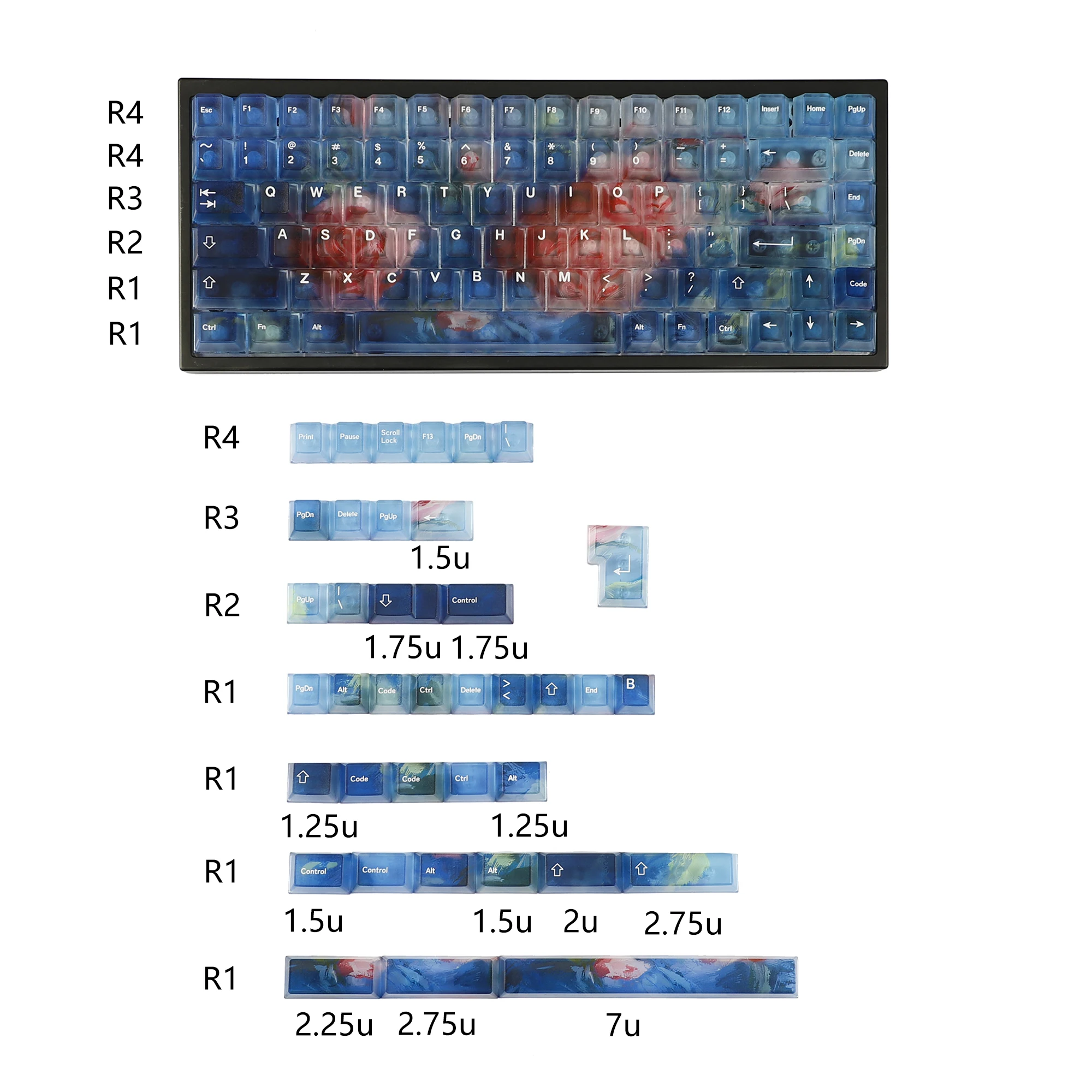 - 122 high-quality PC keycaps with a frosted, translucent finish showcase vibrant marbled cloud patterns in blue, green, yellow, and white, inspired by a starry sky for an artistic look.