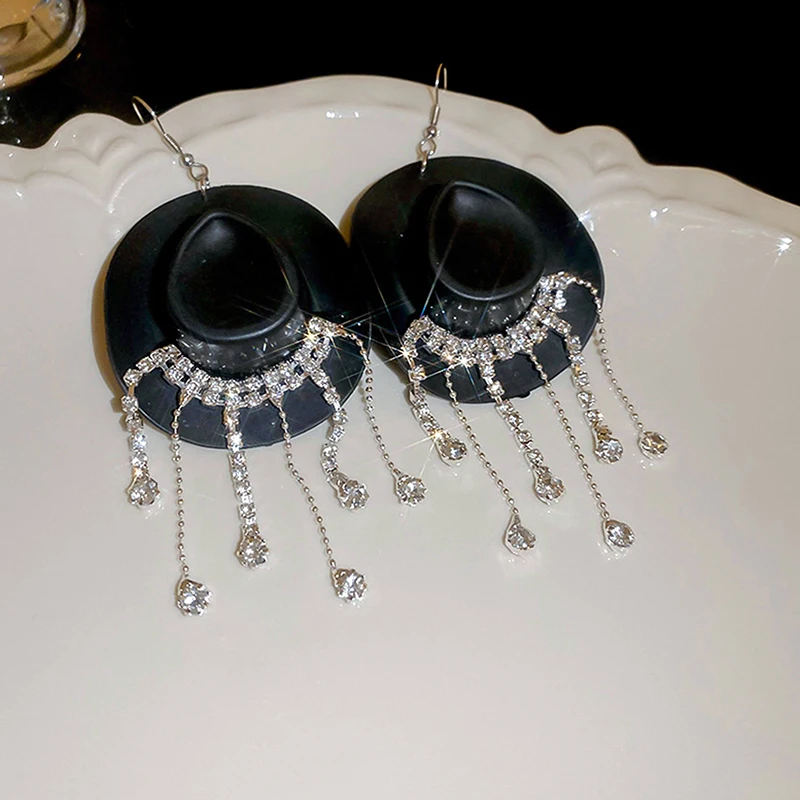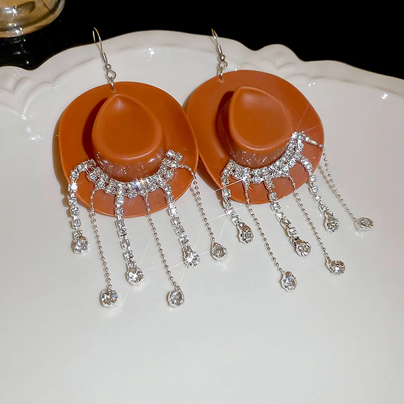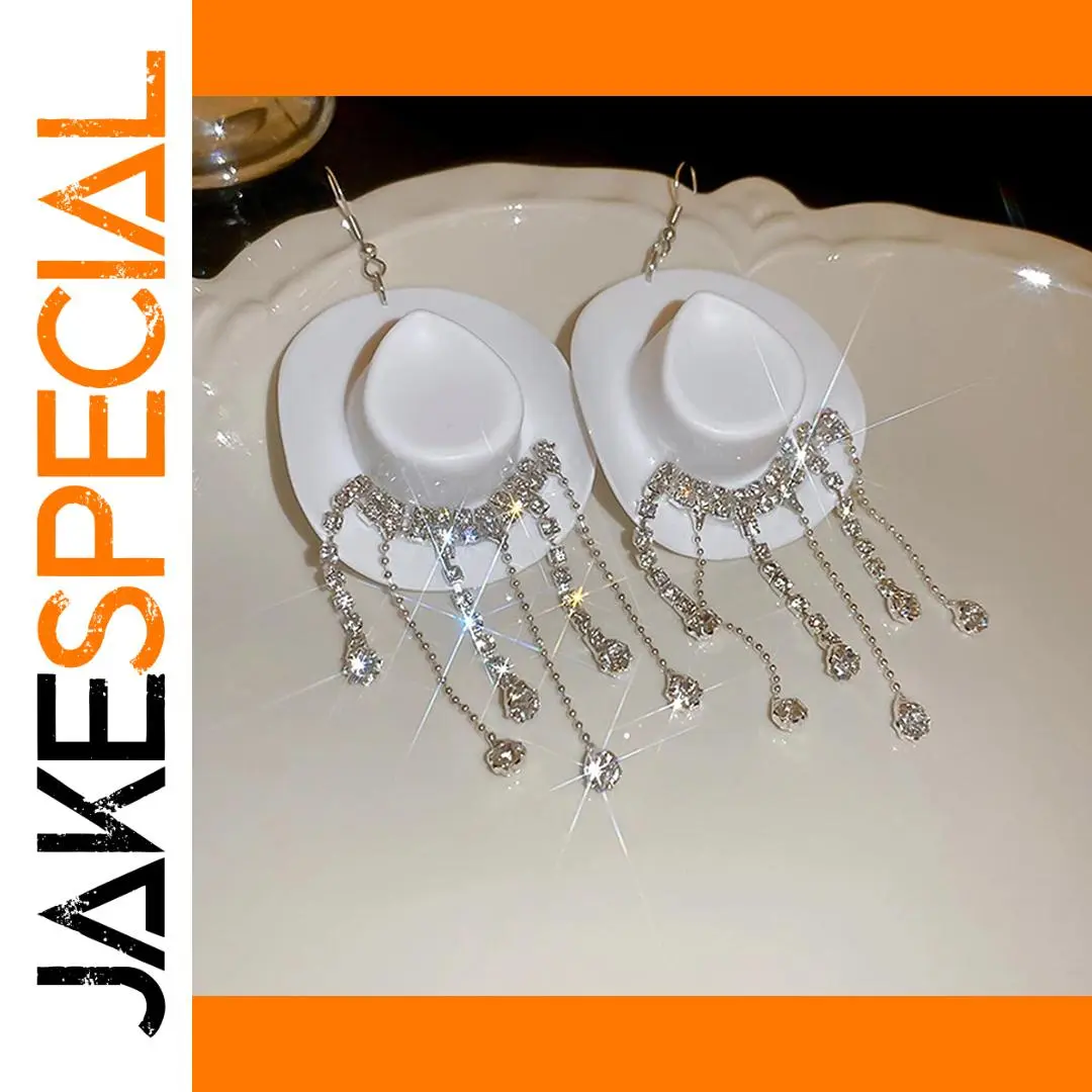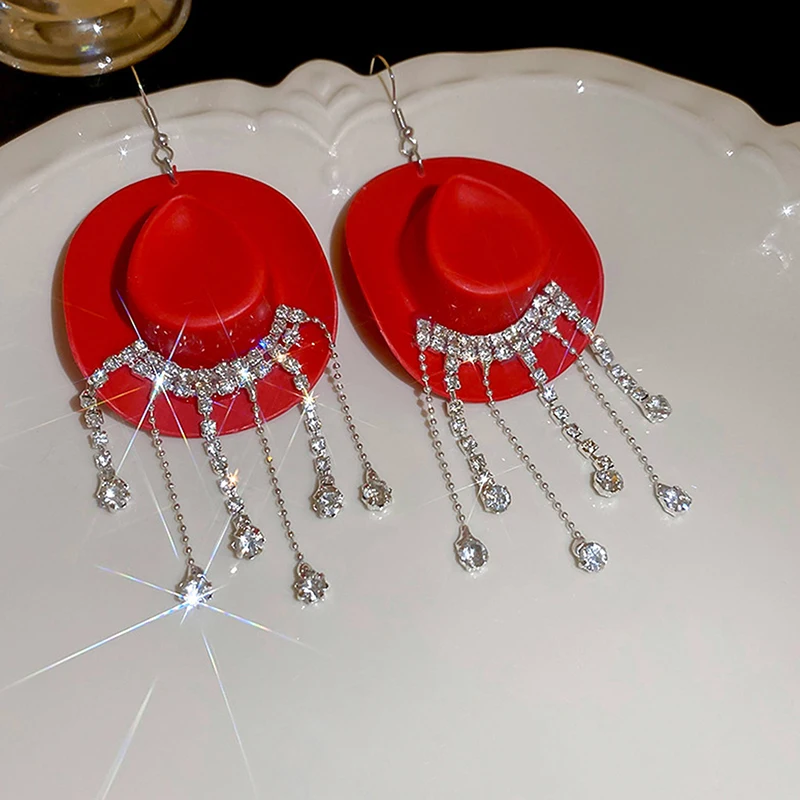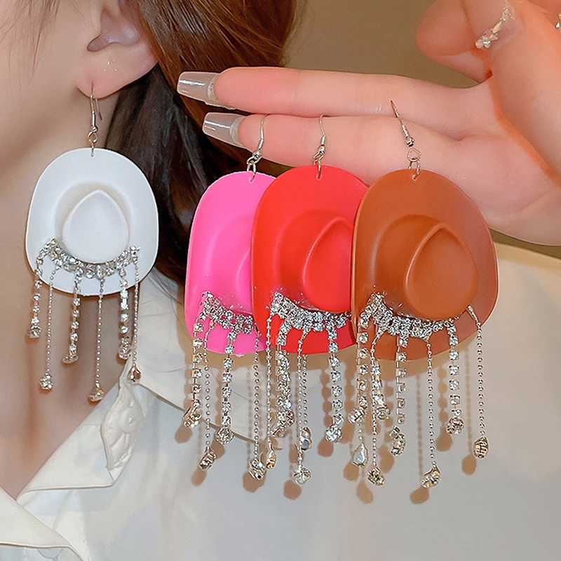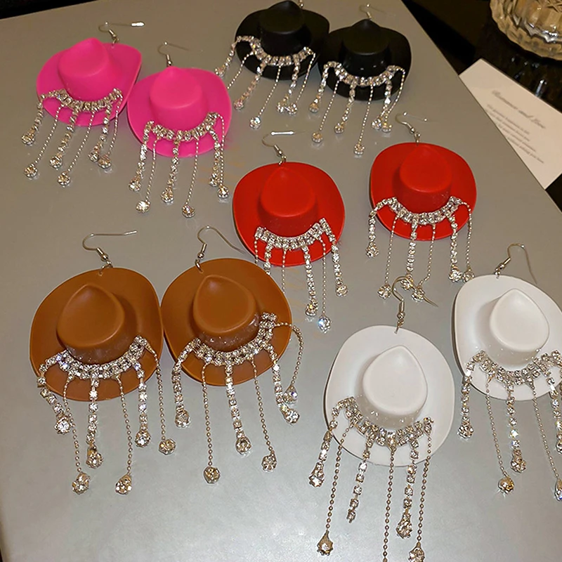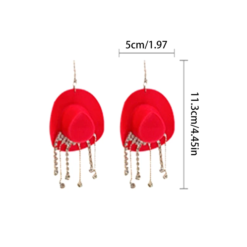 Enhance your style with these bold drop dangle earrings featuring a glossy cowboy hat design and cascading chains adorned with sparkling rhinestones that mimic water droplets. Measuring 11.3 cm by 5 cm, they combine a trendy Western aesthetic with modern elegance. Crafted from high-quality alloys and rhinestones available in black, coffee, pink, red, and white, these earrings offer durability, comfort, and a dazzling appearance. Perfect for adding a fashionable statement to any outfit, these stylish earrings are an excellent choice for women and girls who love unique and eye-catching jewelry.