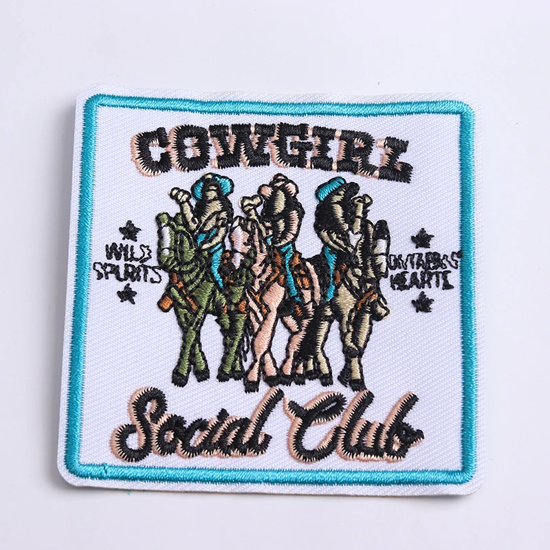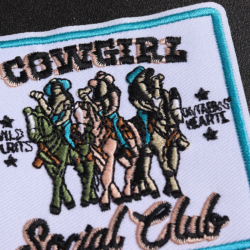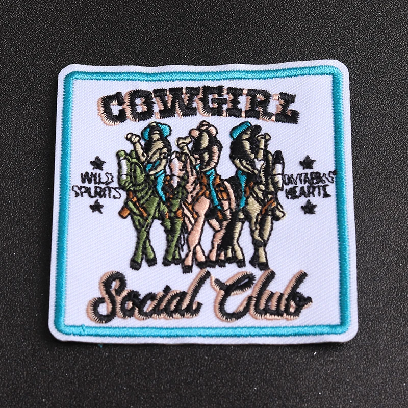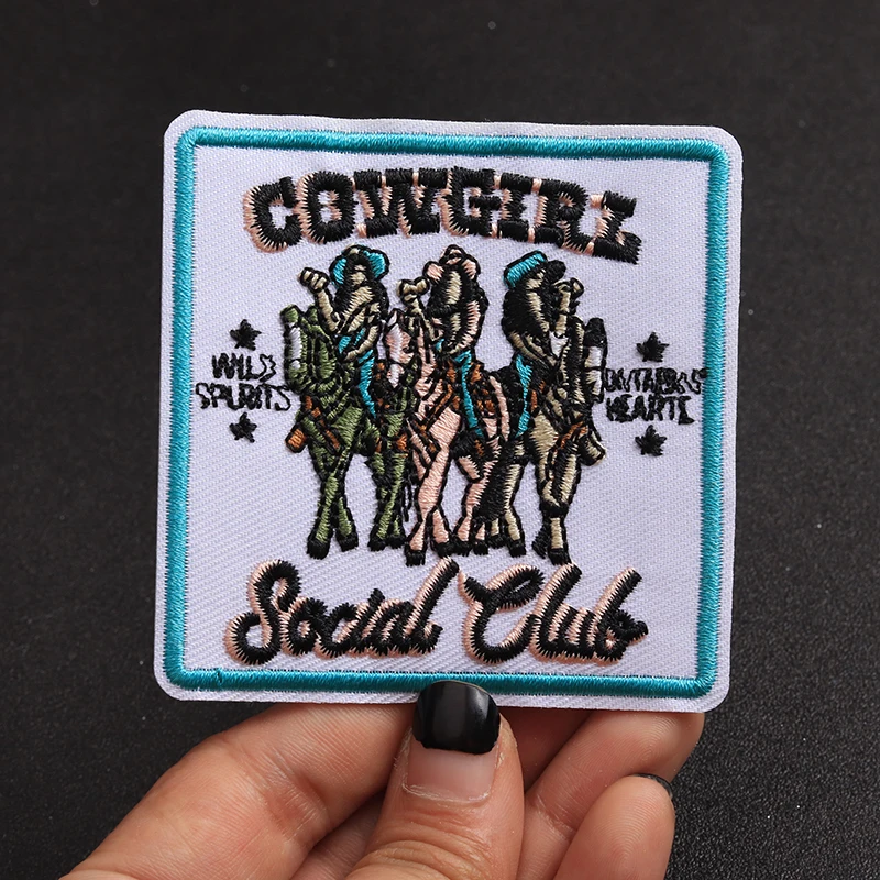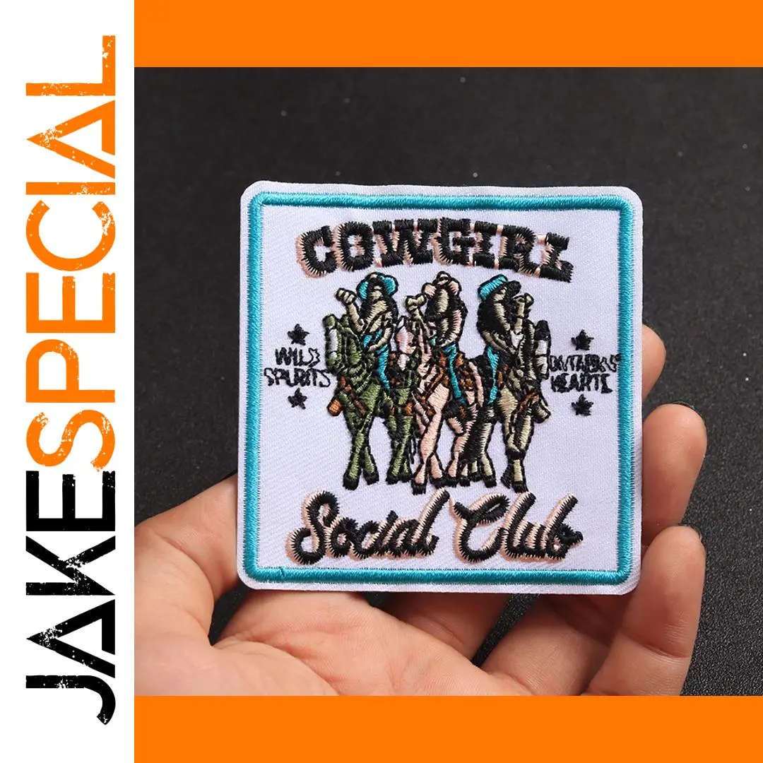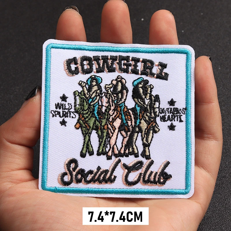 This decorative patch features a captivating cowboy theme, measuring 7.4×7.4 cm. Crafted from eco-friendly non-woven fabric, the patch showcases detailed embroidery of cowboys riding horses in earthy tones, with blue accents on their hats against a vibrant white background. The top proudly displays “COWGIRL” in bold text, while “Social Club” flows gracefully at the bottom, accompanied by small stars and a turquoise border for added flair. Ideal for iron-on applications, this patch is perfect for personalizing t-shirts, coats, bags, and more, bringing a playful, rustic charm to your outfits and accessories.