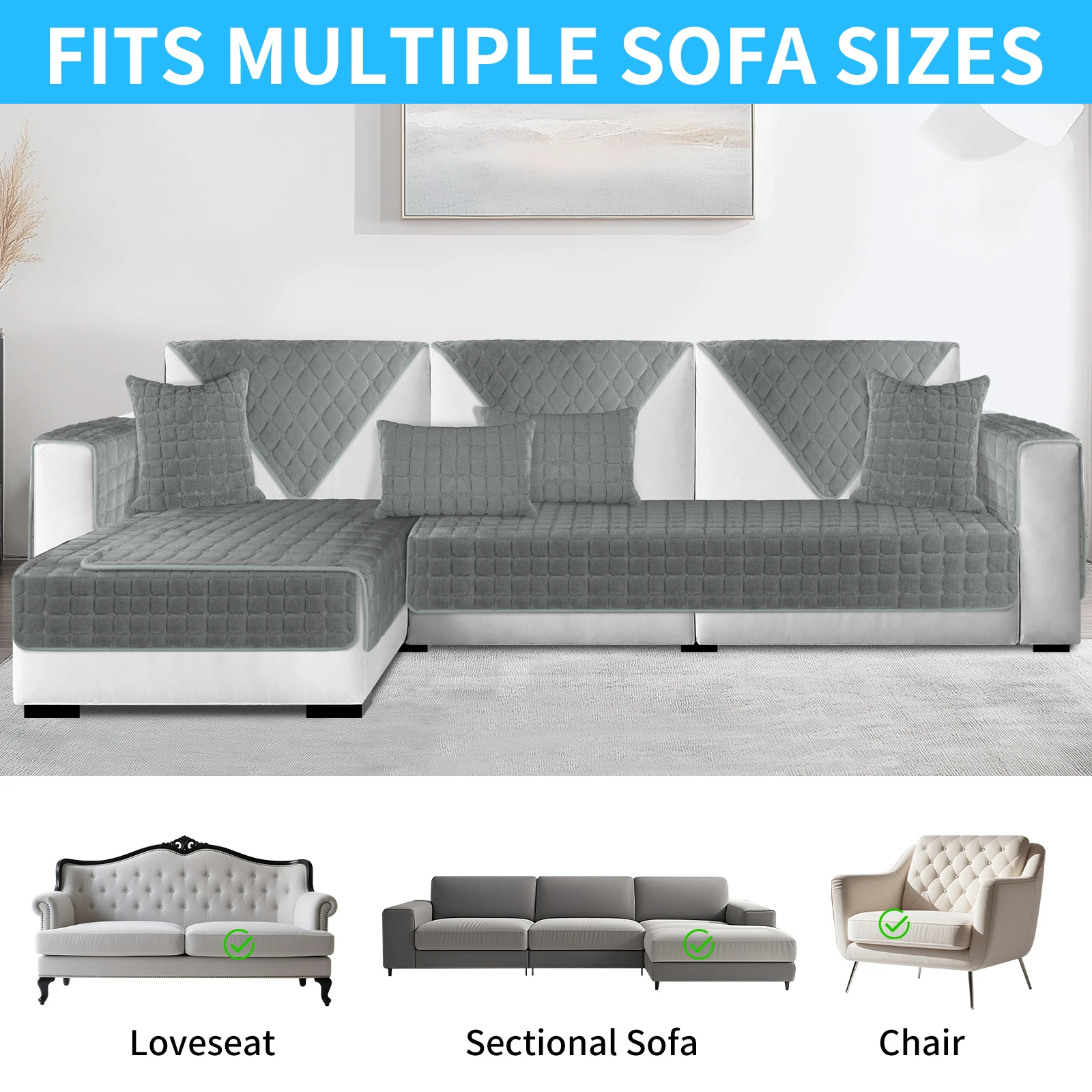 - Designed to fit various sofa types, including L-shaped, accent chairs, loveseats, recliners, futons, and modular sofas for versatile home decor options.