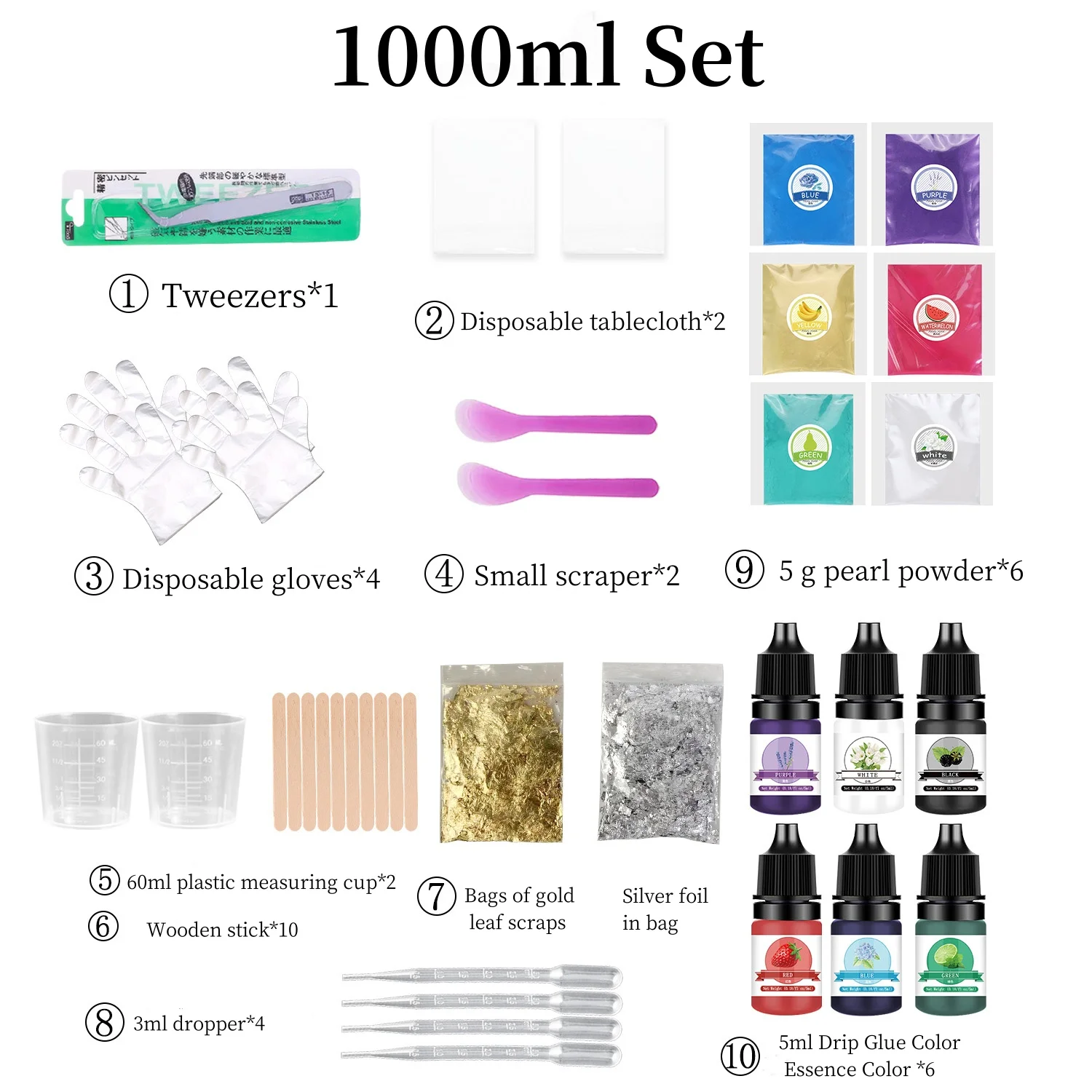 Discover the ultimate DIY epoxy resin kit designed for crafting stunning jewelry and handicrafts. Featuring a sleek black and vibrant color palette, this set combines professional-grade components with an artistic touch. The large 500ml or 1000ml bottles in white or black boast a clean, modern look that inspires confidence. Color-coded pigments in vivid shades like purple, yellow, red, green, blue, and white allow you to personalize each project with eye-catching hues. Clear silicone measuring cups, delicate pink spoons, and natural wooden sticks provide precision and ease of use. Decorative flakes and shimmering foil elements add an elegant, luxurious finish. Elevate your creative process with this comprehensive kit that balances style, function, and quality, making every project a masterpiece.