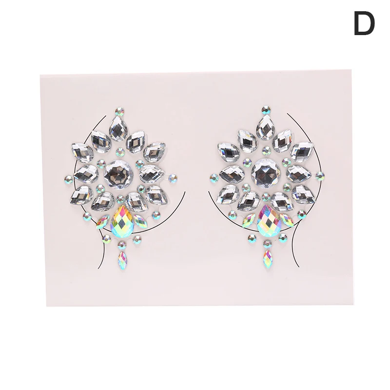 - These nipple covers feature intricate designs with shiny, reflective stones arranged in snowflake, leaf, flower, and wing patterns, available in five elegant colors: A, B, C, D, and E.