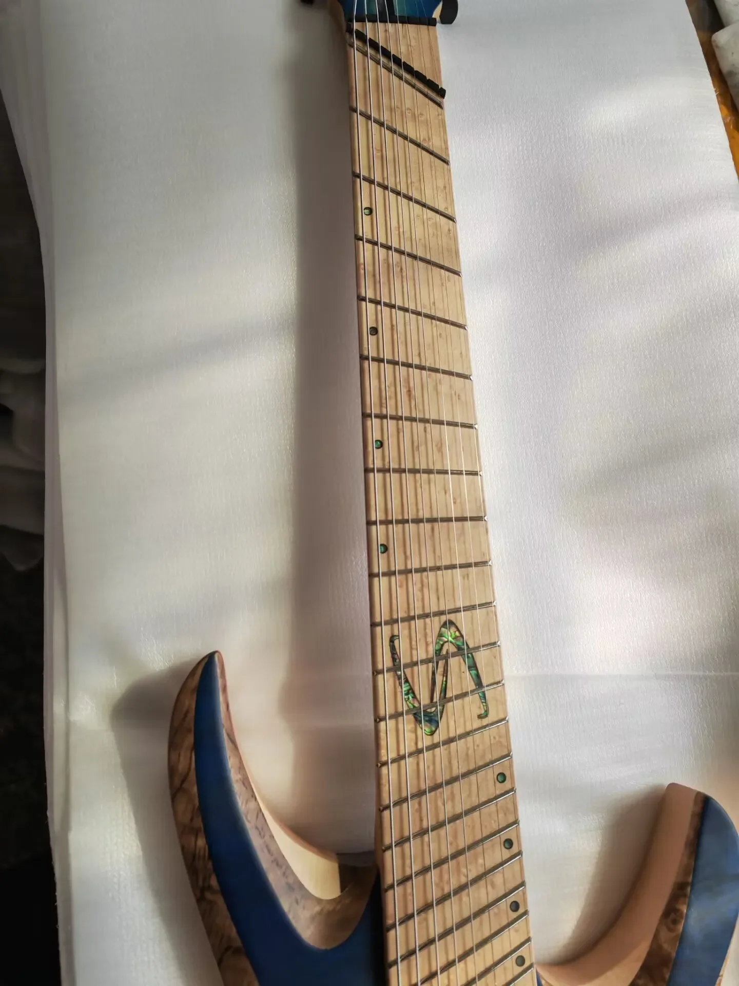 Experience the allure of this custom handmade 8-string fanned electric guitar, designed for passionate players seeking both visual impact and exceptional sound quality. Its ocean fade satin finish with an iridescent teal-blue palette captures attention instantly, evoking a sense of oceanic depth. The contoured body features sharp, angular edges and pointed horns, giving it a modern, aggressive look perfect for stage presence. The natural burl-like grain top adds warmth and contrast, while the black binding emphasizes the dynamic shape. Crafted from high-quality mahogany with a bolt-on construction, this guitar offers durability and excellent resonance. Whether you're performing live or practicing, this instrument promises inspiring playability and eye-catching aesthetics.