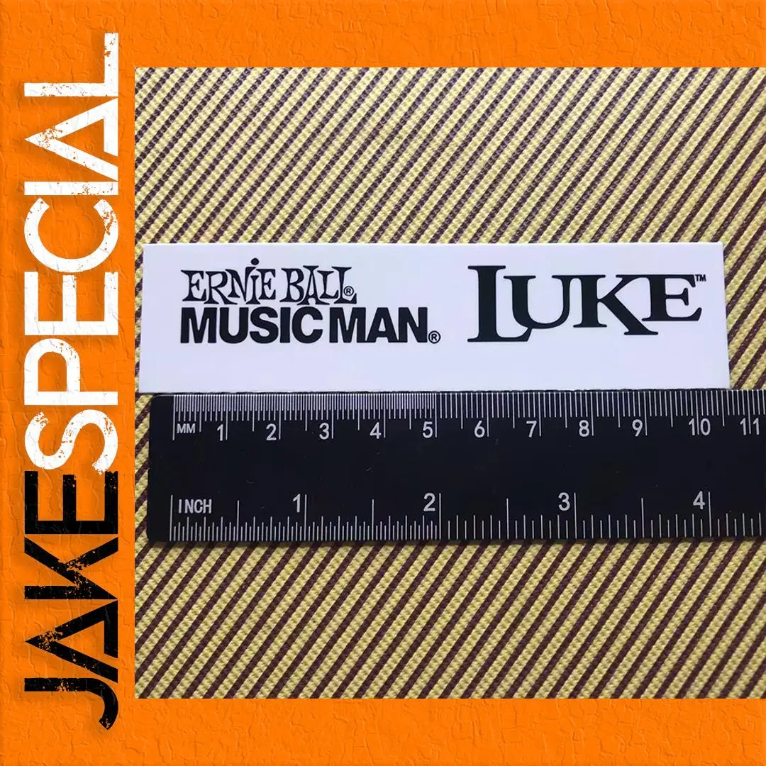 Enhance your electric guitar’s aesthetics with this unique set of three custom DIY waterslide transfer decals, designed specifically for application on guitar necks and headstocks. Featuring bold black lettering that reads “ERNIE BALL MUSIC MAN” and “LUKE” on a pristine white background, this decal brings a sleek, modern look to your instrument. Crafted from quality plastic material, each decal adheres easily to a smooth surface when used correctly. Simply soak in water for around 15 seconds, apply, and allow to dry for approximately 48 hours for a perfect finish.