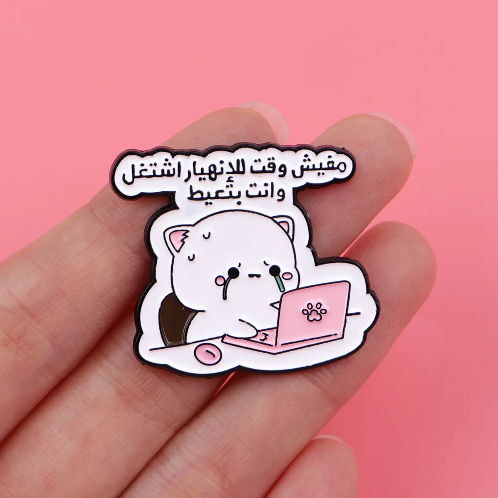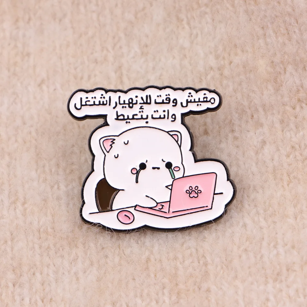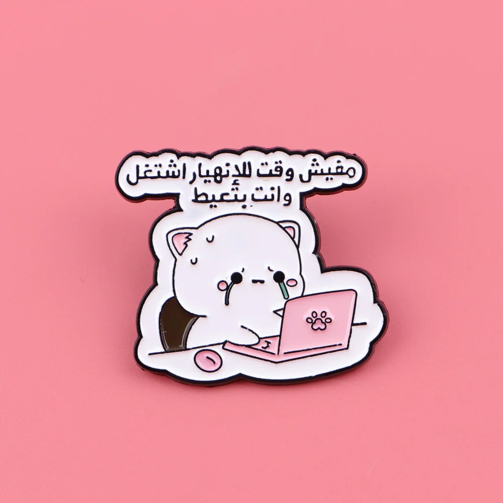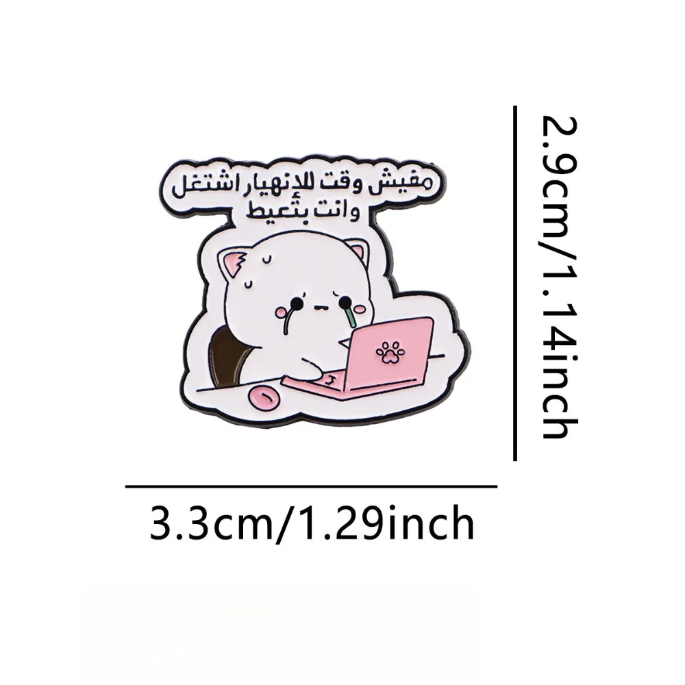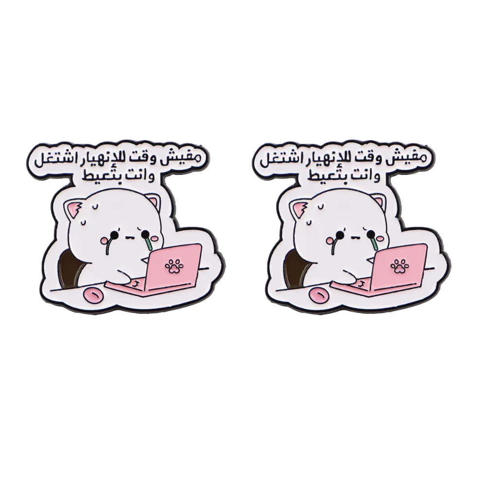 Enhance your accessory collection with this charming set of two cute cat brooches, crafted from durable alloy material in a delightful light grey hue. Each brooch showcases a whimsical cartoon cat sitting at a desk, complete with a pink laptop featuring an adorable paw print design. This design captures a humorous essence, as the cat's expressive face reflects exhaustion or frustration. These versatile pins are perfect for unisex wear and can effortlessly elevate jackets, backpacks, and hats. Transform your outfits with this playful and trendy accessory that resonates with various styles, including punk, gothic, and hip-hop.