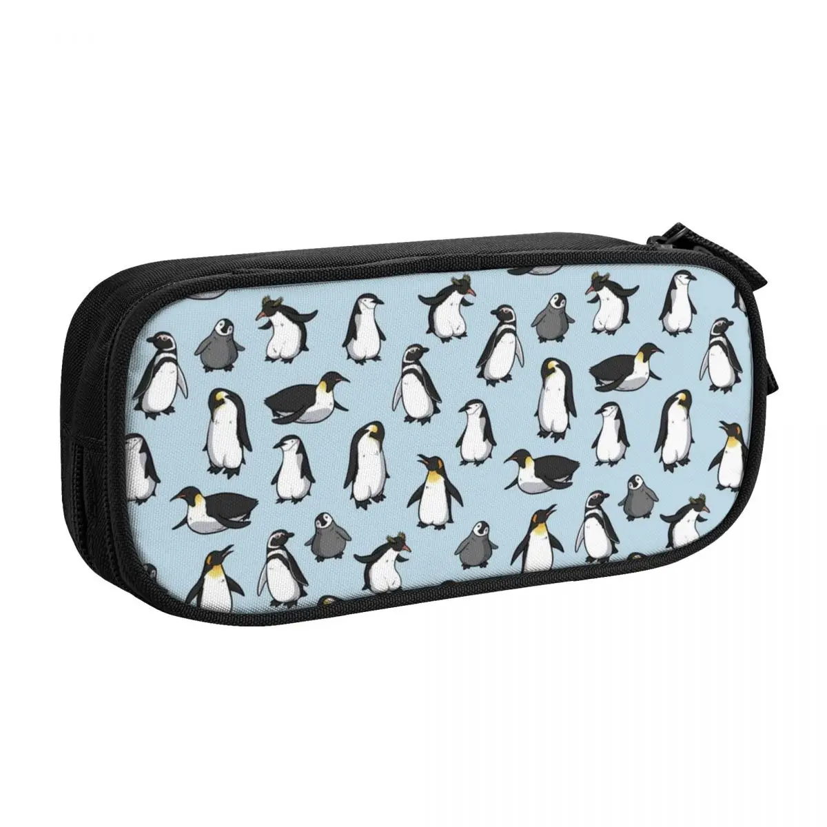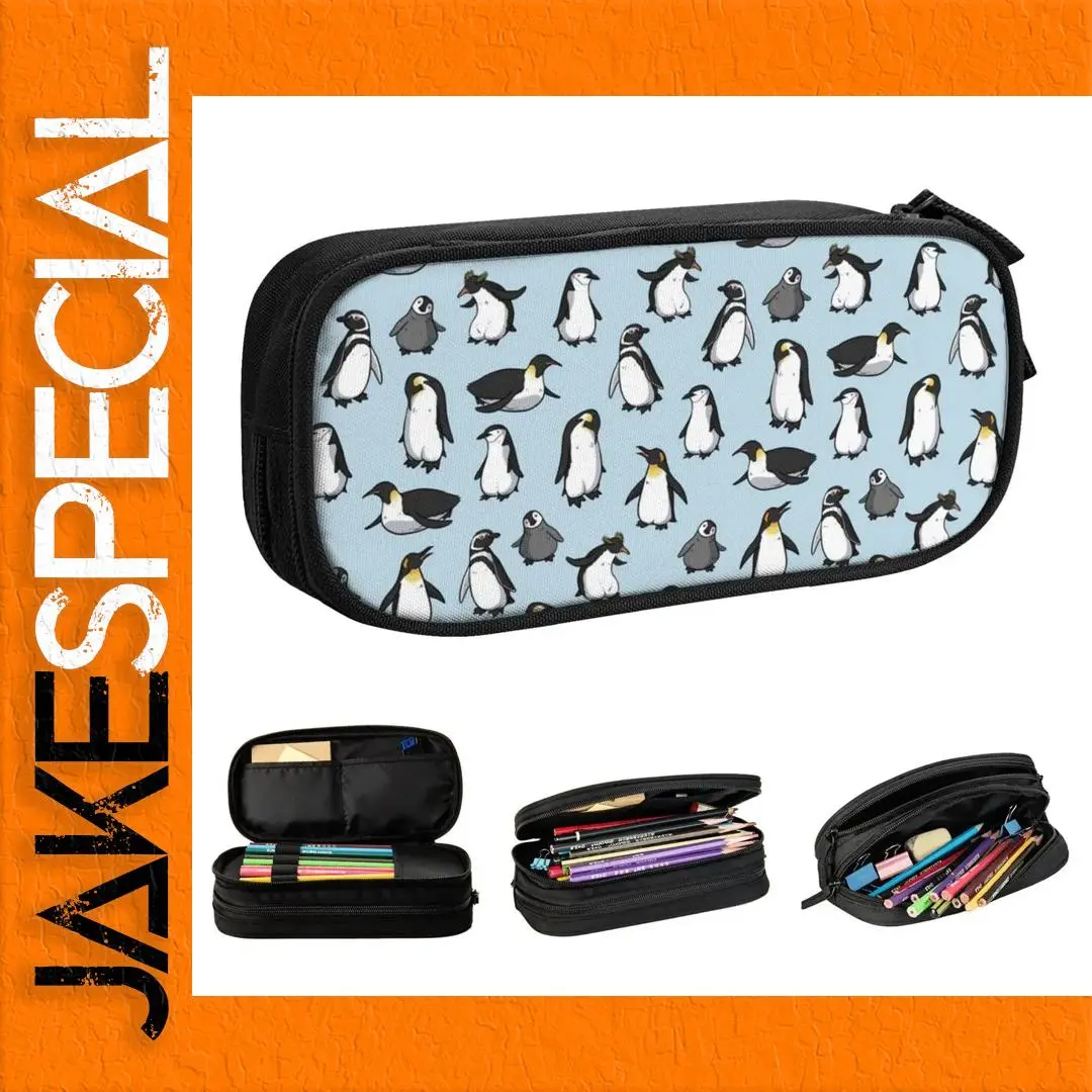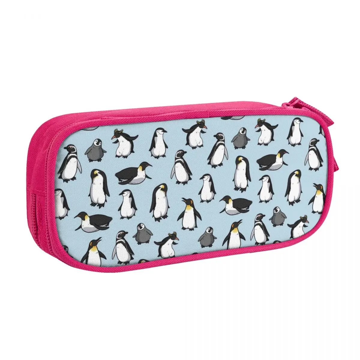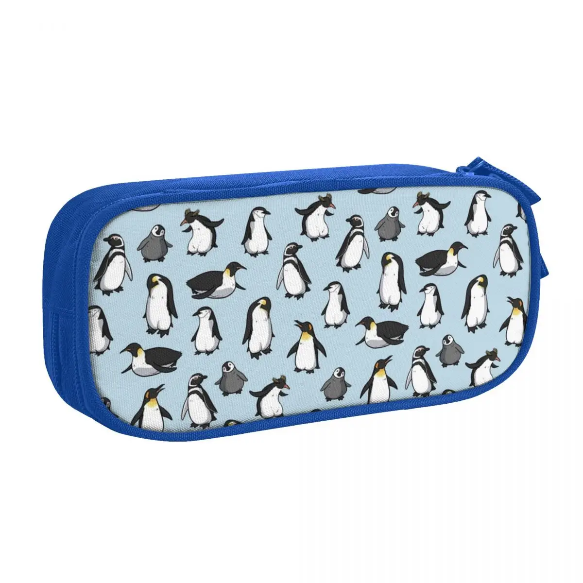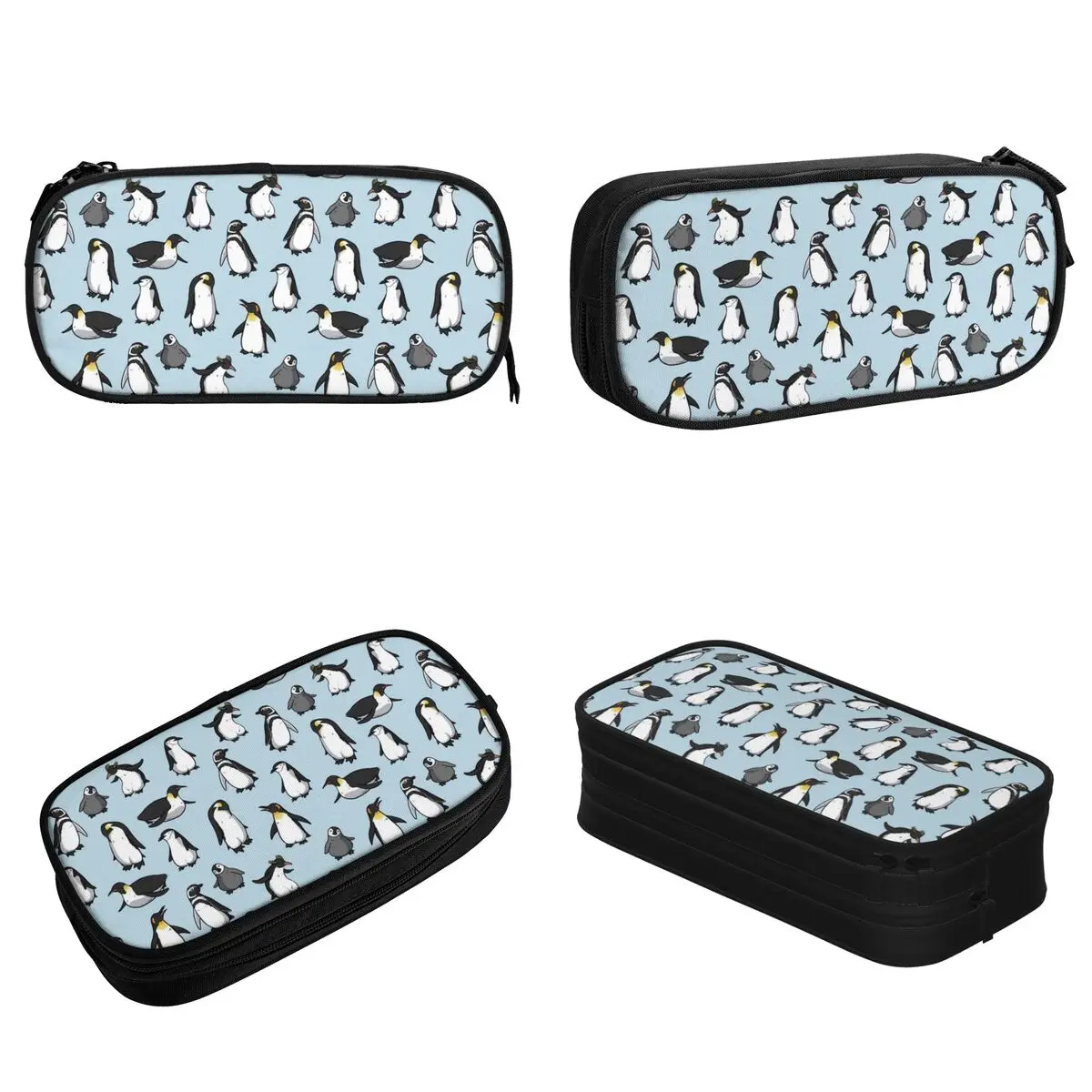 This adorable penguin cartoon-themed pencil case features a charming light blue exterior adorned with playful penguin illustrations, some wearing fun accessories like hats. Its rectangular shape is bordered with a stylish black accent for contrast and includes a practical zipper for easy access. Inside, the spacious compartment boasts organized elastic bands to keep your writing instruments secure, along with additional pockets for various stationery items. Perfect for students and office use, this novelty pencil case combines functionality and cuteness to make your school supplies both enjoyable and accessible. Available colors include black, pink, and blue, with the featured design in light blue.