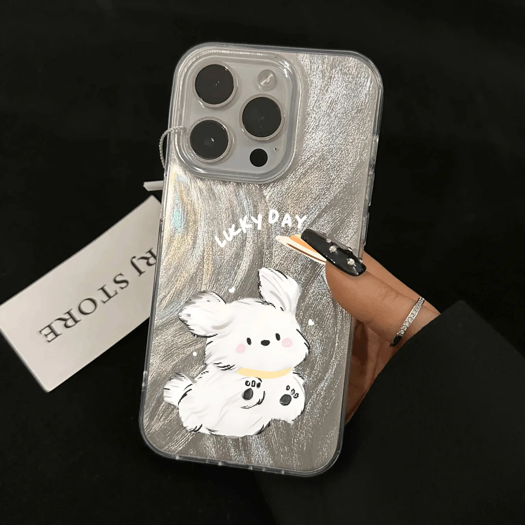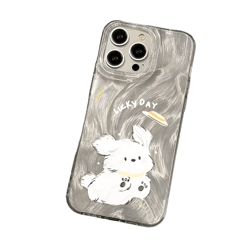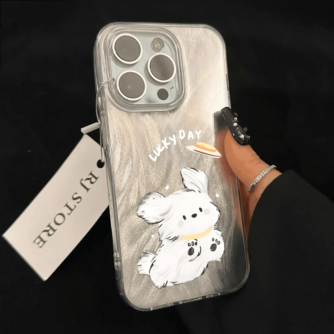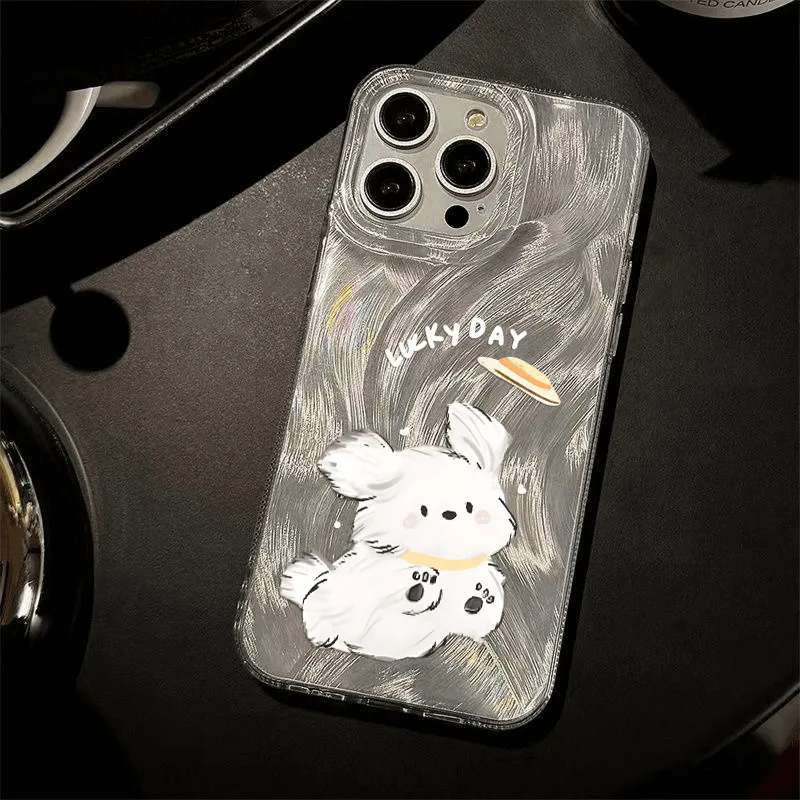 Slip into a world of adorable charm with this cute puppy phone case, designed for a wide range of iPhone models including 11, 12, 13, 14, 15, and 16 series, as well as Pro, Max, Plus, XR, XS, and SE (2020 & 2022). Made from high-quality, smooth plastic with a glossy finish, this case not only offers durability but also a semi-transparent look that subtly showcases your phone's original color. The playful cartoon-style puppy illustration, outlined in bold black lines, features fluffy white fur, large expressive eyes, floppy ears, and tiny paws, radiating cuteness. The design is complemented by handwritten “LUCKYDAY” text and a colorful, whimsical orange-beige dish, evoking fun and youthful energy. This case is perfect for those who love to personalize their device with a playful, lighthearted aesthetic that makes every day special.